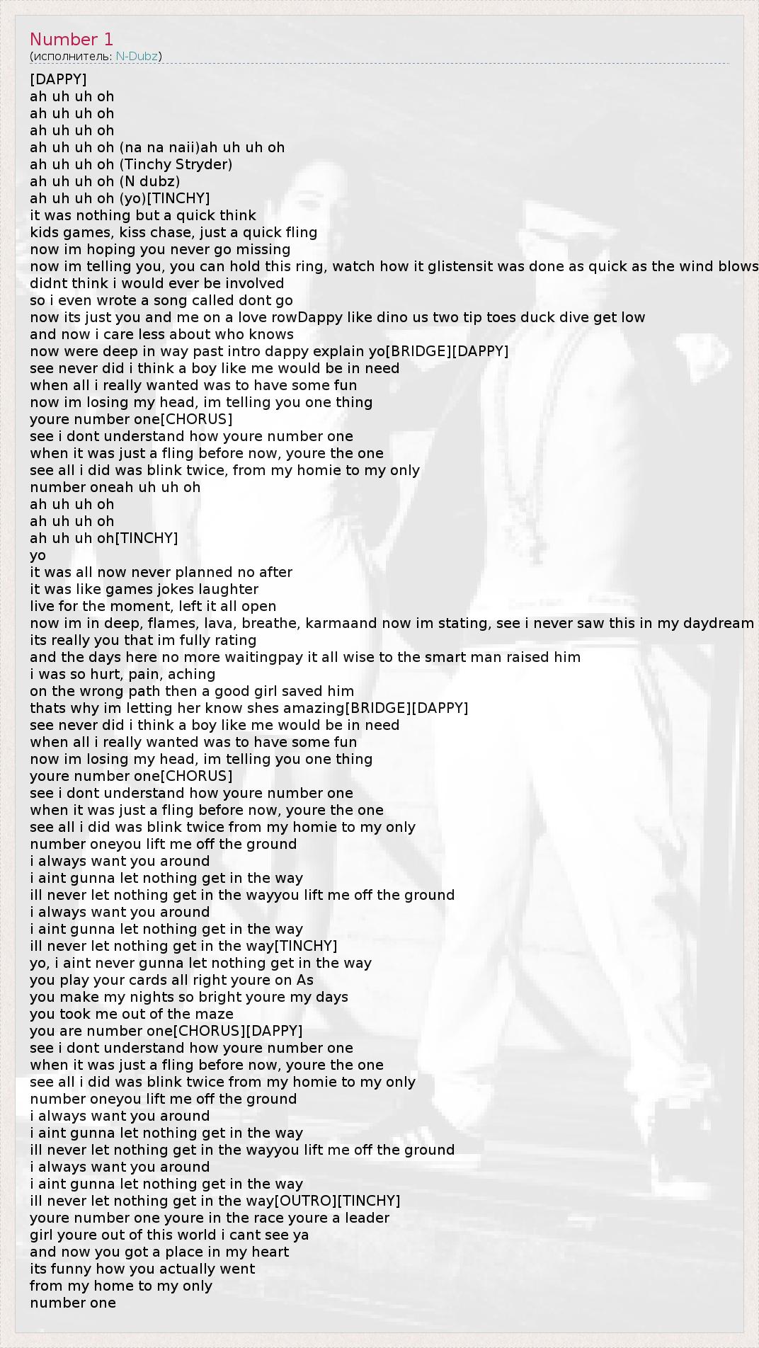 [DAPPY] ah uh uh oh ah uh uh oh ah uh uh oh ah uh uh oh (na na naii)ah uh uh oh ah uh uh oh (Tinchy Stryder) ah uh uh oh (N dubz) ah uh uh oh (yo)[TINCHY] it was nothing but a quick think kids games, kiss chase, just a quick fling now im hoping you never go missing now im telling you, you can hold this ring, watch how it glistensit was done as quick as the wind blows didnt think i would ever be involved so i even wrote a song called dont go now its just you and me on a love rowDappy like dino us two tip toes duck dive get low and now i care less about who knows now were deep in way past intro dappy explain yo[BRIDGE][DAPPY] see never did i think a boy like me would be in need when all i really wanted was to have some fun now im losing my head, im telling you one thing youre number one[CHORUS] see i dont understand how youre number one when it was just a fling before now, youre the one see all i did was blink twice, from my homie to my only number oneah uh uh oh ah uh uh oh ah uh uh oh ah uh uh oh[TINCHY] yo it was all now never planned no after it was like games jokes laughter live for the moment, left it all open now im in deep, flames, lava, breathe, karmaand now im stating, see i never saw this in my daydream its really you that im fully rating and the days here no more waitingpay it all wise to the smart man raised him i was so hurt, pain, aching on the wrong path then a good girl saved him thats why im letting her know shes amazing[BRIDGE][DAPPY] see never did i think a boy like me would be in need when all i really wanted was to have some fun now im losing my head, im telling you one thing youre number one[CHORUS] see i dont understand how youre number one when it was just a fling before now, youre the one see all i did was blink twice from my homie to my only number oneyou lift me off the ground i always want you around i aint gunna let nothing get in the way ill never let nothing get in the wayyou lift me off the ground i always want you around i aint gunna let nothing get in the way ill never let nothing get in the way[TINCHY] yo, i aint never gunna let nothing get in the way you play your cards all right youre on As you make my nights so bright youre my days you took me out of the maze you are number one[CHORUS][DAPPY] see i dont understand how youre number one when it was just a fling before now, youre the one see all i did was blink twice from my homie to my only number oneyou lift me off the ground i always want you around i aint gunna let nothing get in the way ill never let nothing get in the wayyou lift me off the ground i always want you around i aint gunna let nothing get in the way ill never let nothing get in the way[OUTRO][TINCHY] youre number one youre in the race youre a leader girl youre out of this world i cant see ya and now you got a place in my heart its funny how you actually went from my home to my only number one