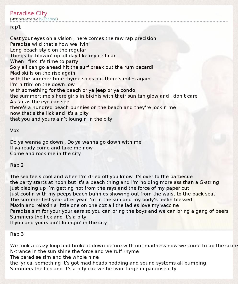 rap1 Cast your eyes on a vision , here comes the raw rap precision Paradise wild that's how we livin' Long beach style on the regular Things be blowin' up all day like my cellular When I flex it's time to party So y'all can go ahead hit the surf break out the rum bacardi Mad skills on the rise again with the summer time rhyme solos out there's miles again I'm hittin' on the down low with something for the beach or ya jeep or ya condo the summertime's here girls in bikinis with their sun tan glow and I don't care As far as the eye can see there's a hundred beach bunnies on the beach and they're jockin me now that's the lick and it's a pity that you and yours ain't loungin in the city Vox Do ya wanna go down , Do ya wanna go down with me If ya ready come and take me now Come and rock me in the city Rap 2 The sea feels cool and when I'm dried off you know it's over to the barbecue the party starts at noon but it's a beach thing and I'm holding more ass than a G-string Just blazing up I'm getting hot from the rays and the force of my paper cut Just coolin with my peeps beach bunnies showing out from the waist to the back seat The summer fest year after year I'm in the sun and my body's feelin blessed Maxin and relaxin a little one on one coz all the ladies love my vaccine Paradise sim for your your ears so you can bring the boys and we can bring a gang of beers Summers the lick and it's a pity If you and yours ain't loungin' in the city Rap 3 We took a crazy loop and broke it down before with our madness now we come to up the score N-trance in the sun shine the force and we ruff rhyme The paradise sim and the whole nine the lyrical something it's got mad heads nodding and sound systems all bumping Summers the lick and it's a pity coz we be livin' large in paradise city