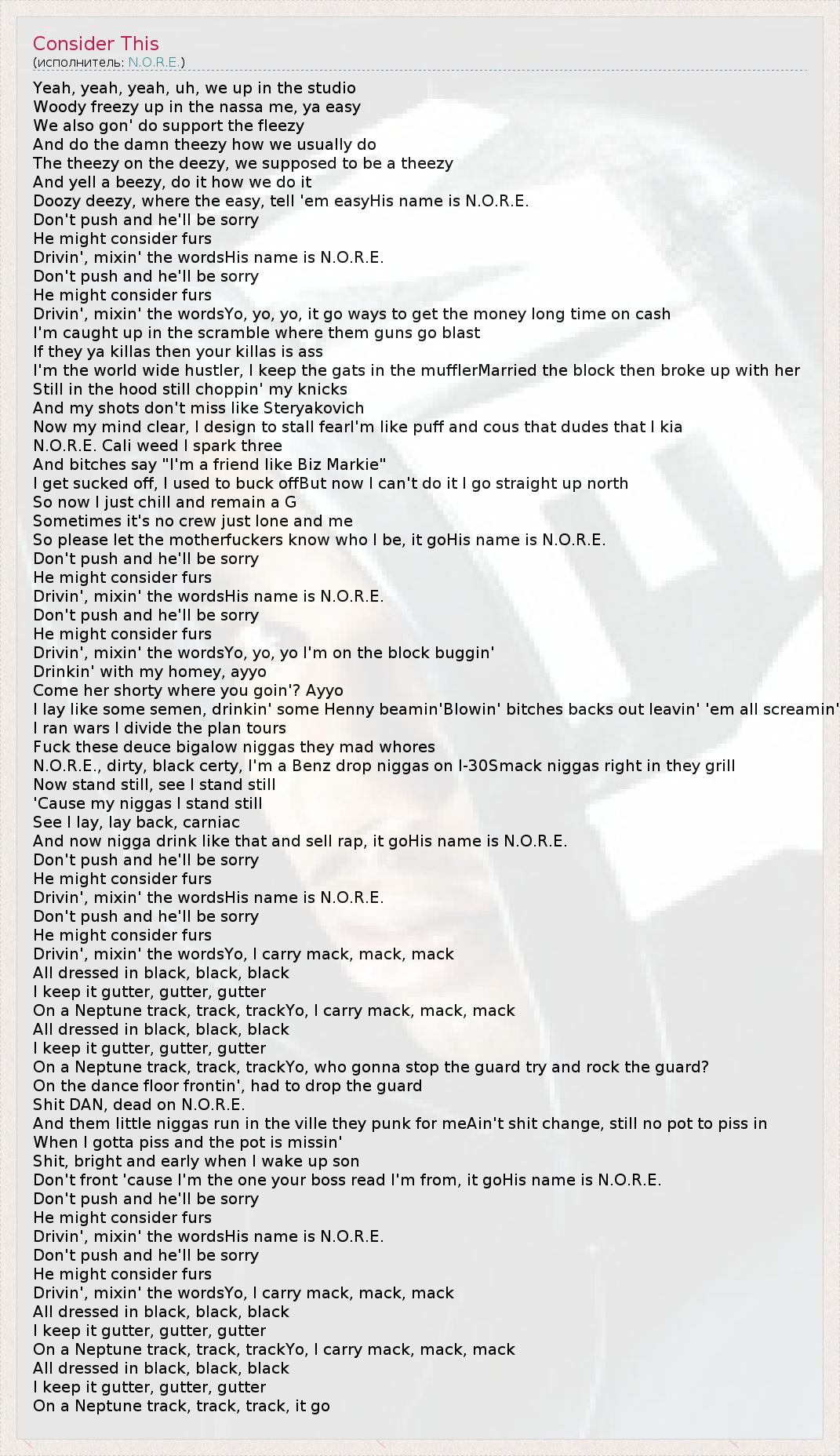Yeah, yeah, yeah, uh, we up in the studio Woody freezy up in the nassa me, ya easy We also gon' do support the fleezy And do the damn theezy how we usually do The theezy on the deezy, we supposed to be a theezy And yell a beezy, do it how we do it Doozy deezy, where the easy, tell 'em easyHis name is N.O.R.E. Don't push and he'll be sorry He might consider furs Drivin', mixin' the wordsHis name is N.O.R.E. Don't push and he'll be sorry He might consider furs Drivin', mixin' the wordsYo, yo, yo, it go ways to get the money long time on cash I'm caught up in the scramble where them guns go blast If they ya killas then your killas is ass I'm the world wide hustler, I keep the gats in the mufflerMarried the block then broke up with her Still in the hood still choppin' my knicks And my shots don't miss like Steryakovich Now my mind clear, I design to stall fearI'm like puff and cous that dudes that I kia N.O.R.E. Cali weed I spark three And bitches say "I'm a friend like Biz Markie" I get sucked off, I used to buck offBut now I can't do it I go straight up north So now I just chill and remain a G Sometimes it's no crew just lone and me So please let the motherfuckers know who I be, it goHis name is N.O.R.E. Don't push and he'll be sorry He might consider furs Drivin', mixin' the wordsHis name is N.O.R.E. Don't push and he'll be sorry He might consider furs Drivin', mixin' the wordsYo, yo, yo I'm on the block buggin' Drinkin' with my homey, ayyo Come her shorty where you goin'? Ayyo I lay like some semen, drinkin' some Henny beamin'Blowin' bitches backs out leavin' 'em all screamin' I ran wars I divide the plan tours Fuck these deuce bigalow niggas they mad whores N.O.R.E., dirty, black certy, I'm a Benz drop niggas on I-30Smack niggas right in they grill Now stand still, see I stand still 'Cause my niggas I stand still See I lay, lay back, carniac And now nigga drink like that and sell rap, it goHis name is N.O.R.E. Don't push and he'll be sorry He might consider furs Drivin', mixin' the wordsHis name is N.O.R.E. Don't push and he'll be sorry He might consider furs Drivin', mixin' the wordsYo, I carry mack, mack, mack All dressed in black, black, black I keep it gutter, gutter, gutter On a Neptune track, track, trackYo, I carry mack, mack, mack All dressed in black, black, black I keep it gutter, gutter, gutter On a Neptune track, track, trackYo, who gonna stop the guard try and rock the guard? On the dance floor frontin', had to drop the guard Shit DAN, dead on N.O.R.E. And them little niggas run in the ville they punk for meAin't shit change, still no pot to piss in When I gotta piss and the pot is missin' Shit, bright and early when I wake up son Don't front 'cause I'm the one your boss read I'm from, it goHis name is N.O.R.E. Don't push and he'll be sorry He might consider furs Drivin', mixin' the wordsHis name is N.O.R.E. Don't push and he'll be sorry He might consider furs Drivin', mixin' the wordsYo, I carry mack, mack, mack All dressed in black, black, black I keep it gutter, gutter, gutter On a Neptune track, track, trackYo, I carry mack, mack, mack All dressed in black, black, black I keep it gutter, gutter, gutter On a Neptune track, track, track, it go