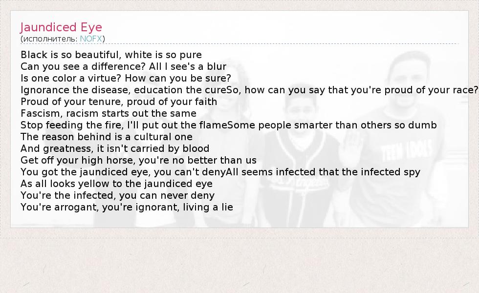 Black is so beautiful, white is so pure Can you see a difference? All I see's a blur Is one color a virtue? How can you be sure? Ignorance the disease, education the cureSo, how can you say that you're proud of your race? Proud of your tenure, proud of your faith Fascism, racism starts out the same Stop feeding the fire, I'll put out the flameSome people smarter than others so dumb The reason behind is a cultural one And greatness, it isn't carried by blood Get off your high horse, you're no better than us You got the jaundiced eye, you can't denyAll seems infected that the infected spy As all looks yellow to the jaundiced eye You're the infected, you can never deny You're arrogant, you're ignorant, living a lie