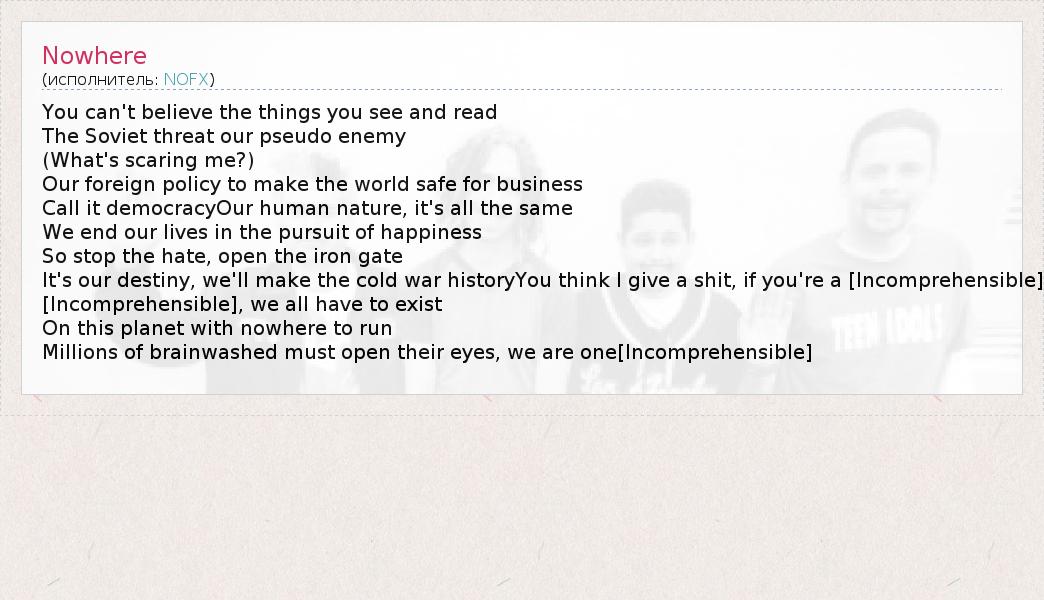 Это интересно:NOFX («НоуЭфЭкс») — группа из Сан-Франциско, штат Калифорния, образованная в 1983 г.Изначально группа состояла из вокалиста Фэт Майка (Настоящее имя - Майк Бёркетт), барабанщика Эрика Сэндина и гитариста Эрика Мэлвина.С 1991 г. вторым гитаристом и трубачом стал Эль Хэфе.Тексты группы, нередко саркастические, посвящены политике, обществу, различным субкультурам, расизму, звукозаписывающей... продолжение