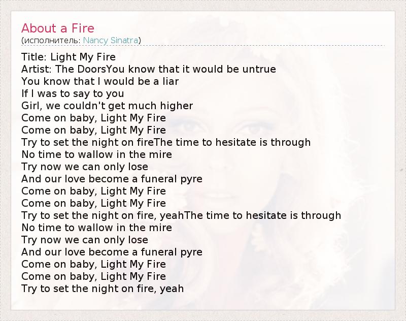Title: Light My Fire Artist: The DoorsYou know that it would be untrue You know that I would be a liar If I was to say to you Girl, we couldn't get much higher Come on baby, Light My Fire Come on baby, Light My Fire Try to set the night on fireThe time to hesitate is through No time to wallow in the mire Try now we can only lose And our love become a funeral pyre Come on baby, Light My Fire Come on baby, Light My Fire Try to set the night on fire, yeahThe time to hesitate is through No time to wallow in the mire Try now we can only lose And our love become a funeral pyre Come on baby, Light My Fire Come on baby, Light My Fire Try to set the night on fire, yeah