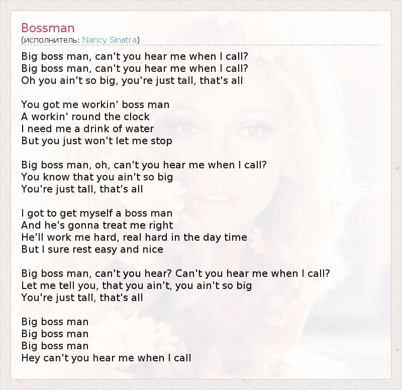Big boss man, can't you hear me when I call? Big boss man, can't you hear me when I call? Oh you ain't so big, you're just tall, that's all You got me workin' boss man A workin' round the clock I need me a drink of water But you just won't let me stop Big boss man, oh, can't you hear me when I call? You know that you ain't so big You're just tall, that's all I got to get myself a boss man And he's gonna treat me right He'll work me hard, real hard in the day time But I sure rest easy and nice Big boss man, can't you hear? Can't you hear me when I call? Let me tell you, that you ain't, you ain't so big You're just tall, that's all Big boss man Big boss man Big boss man Hey can't you hear me when I call