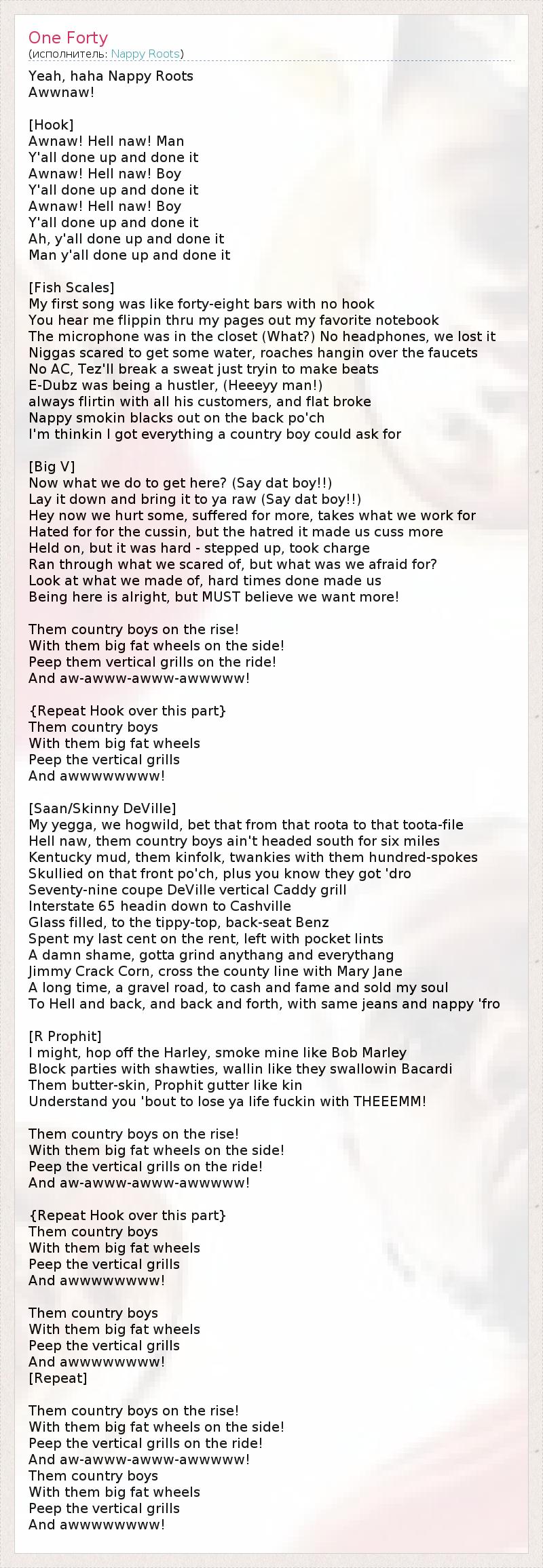 Это интересно:Nappy Roots представители Альтернативного Американского Южного Рэпа зародившегося в городке Bowling Green в 1995 году и больше всего известным по синглу 2002 года "Po' Folks".Группа состоит из Milledgeville, Fish Scales, Skinny DeVille, B. Stille,... продолжение