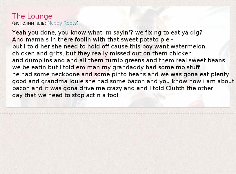 Это интересно:Nappy Roots представители Альтернативного Американского Южного Рэпа зародившегося в городке Bowling Green в 1995 году и больше всего известным по синглу 2002 года "Po' Folks".Группа состоит из Milledgeville, Fish Scales, Skinny DeVille, B. Stille,... продолжение