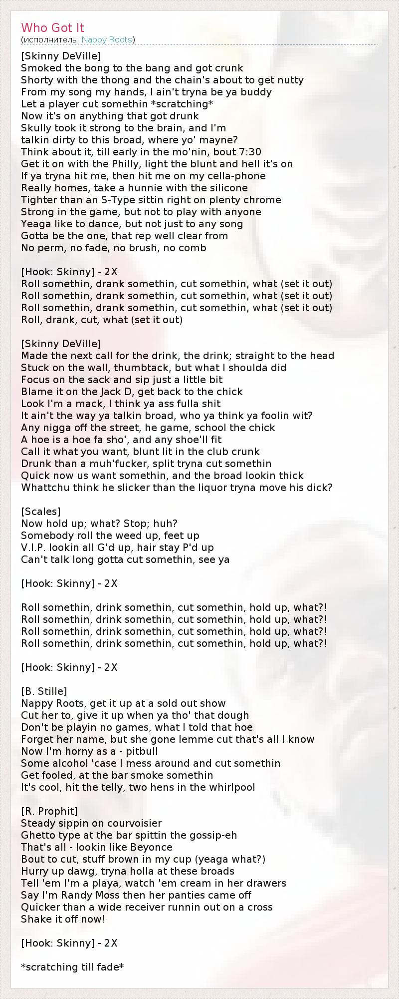 [Skinny DeVille] Smoked the bong to the bang and got crunk Shorty with the thong and the chain's about to get nutty From my song my hands, I ain't tryna be ya buddy Let a player cut somethin *scratching* Now it's on anything that got drunk Skully took it strong to the brain, and I'm talkin dirty to this broad, where yo' mayne? Think about it, till early in the mo'nin, bout 7:30 Get it on with the Philly, light the blunt and hell it's on If ya tryna hit me, then hit me on my cella-phone Really homes, take a hunnie with the silicone Tighter than an S-Type sittin right on plenty chrome Strong in the game, but not to play with anyone Yeaga like to dance, but not just to any song Gotta be the one, that rep well clear from No perm, no fade, no brush, no comb [Hook: Skinny] - 2X Roll somethin, drank somethin, cut somethin, what (set it out) Roll somethin, drank somethin, cut somethin, what (set it out) Roll somethin, drank somethin, cut somethin, what (set it out) Roll, drank, cut, what (set it out) [Skinny DeVille] Made the next call for the drink, the drink; straight to the head Stuck on the wall, thumbtack, but what I shoulda did Focus on the sack and sip just a little bit Blame it on the Jack D, get back to the chick Look I'm a mack, I think ya ass fulla shit It ain't the way ya talkin broad, who ya think ya foolin wit? Any nigga off the street, he game, school the chick A hoe is a hoe fa sho', and any shoe'll fit Call it what you want, blunt lit in the club crunk Drunk than a muh'fucker, split tryna cut somethin Quick now us want somethin, and the broad lookin thick Whattchu think he slicker than the liquor tryna move his dick? [Scales] Now hold up; what? Stop; huh? Somebody roll the weed up, feet up V.I.P. lookin all G'd up, hair stay P'd up Can't talk long gotta cut somethin, see ya [Hook: Skinny] - 2X Roll somethin, drink somethin, cut somethin, hold up, what?! Roll somethin, drink somethin, cut somethin, hold up, what?! Roll somethin, drink somethin, cut somethin, hold up, what?! Roll somethin, drink somethin, cut somethin, hold up, what?! [Hook: Skinny] - 2X [B. Stille] Nappy Roots, get it up at a sold out show Cut her to, give it up when ya tho' that dough Don't be playin no games, what I told that hoe Forget her name, but she gone lemme cut that's all I know Now I'm horny as a - pitbull Some alcohol 'case I mess around and cut somethin Get fooled, at the bar smoke somethin It's cool, hit the telly, two hens in the whirlpool [R. Prophit] Steady sippin on courvoisier Ghetto type at the bar spittin the gossip-eh That's all - lookin like Beyonce Bout to cut, stuff brown in my cup (yeaga what?) Hurry up dawg, tryna holla at these broads Tell 'em I'm a playa, watch 'em cream in her drawers Say I'm Randy Moss then her panties came off Quicker than a wide receiver runnin out on a cross Shake it off now! [Hook: Skinny] - 2X *scratching till fade*