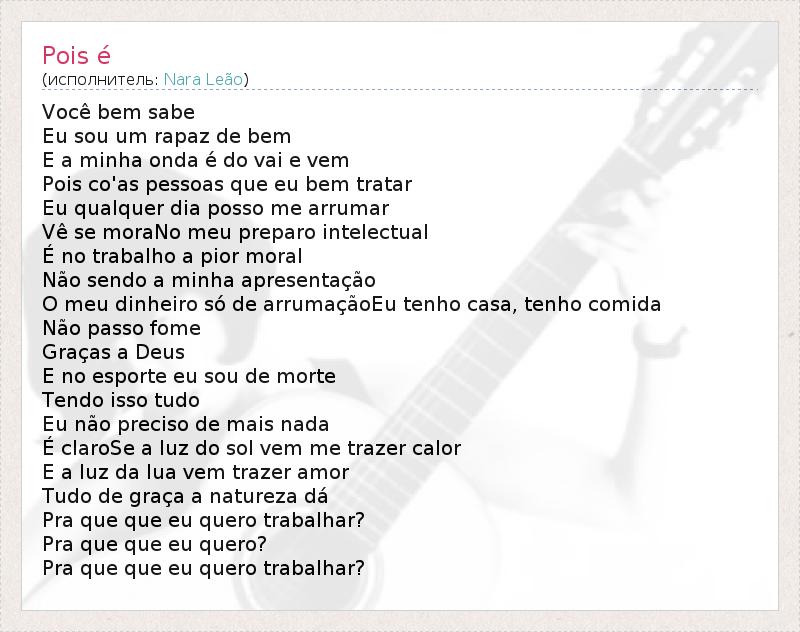 Это интересно:Nara Leão (19 января 1942 - 7 июня 1989 года) - бразильская певица в стиле босса-нова (Bossa Nova) и MPB (стиль популярной бразильской музыки). Ее мужем был Carlos Diegues, режиссер и сценарист.Когда ей было двенадцать, ее отец отдал её учиться игре на гитаре, поскольку был обеспокоен ее застенчивым характером. Композитор Patricio Teixeira и классические гитарист Solon Ayala были её учителями.Она была известна как "муза... продолжение