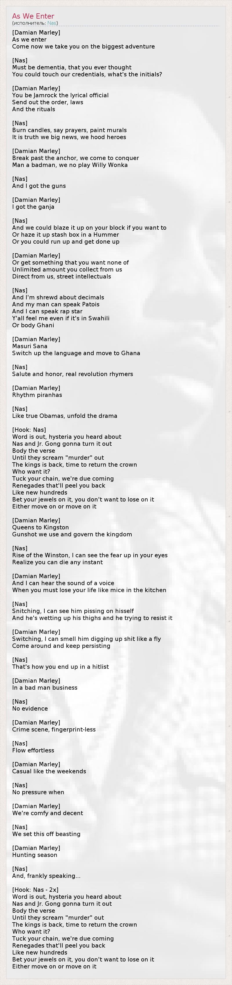 [Damian Marley] As we enter Come now we take you on the biggest adventure [Nas] Must be dementia, that you ever thought You could touch our credentials, what's the initials? [Damian Marley] You be Jamrock the lyrical official Send out the order, laws And the rituals [Nas] Burn candles, say prayers, paint murals It is truth we big news, we hood heroes [Damian Marley] Break past the anchor, we come to conquer Man a badman, we no play Willy Wonka [Nas] And I got the guns [Damian Marley] I got the ganja [Nas] And we could blaze it up on your block if you want to Or haze it up stash box in a Hummer Or you could run up and get done up [Damian Marley] Or get something that you want none of Unlimited amount you collect from us Direct from us, street intellectuals [Nas] And I'm shrewd about decimals And my man can speak Patois And I can speak rap star Y'all feel me even if it's in Swahili Or body Ghani [Damian Marley] Masuri Sana Switch up the language and move to Ghana [Nas] Salute and honor, real revolution rhymers [Damian Marley] Rhythm piranhas [Nas] Like true Obamas, unfold the drama [Hook: Nas] Word is out, hysteria you heard about Nas and Jr. Gong gonna turn it out Body the verse Until they scream "murder" out The kings is back, time to return the crown Who want it? Tuck your chain, we're due coming Renegades that'll peel you back Like new hundreds Bet your jewels on it, you don't want to lose on it Either move on or move on it [Damian Marley] Queens to Kingston Gunshot we use and govern the kingdom [Nas] Rise of the Winston, I can see the fear up in your eyes Realize you can die any instant [Damian Marley] And I can hear the sound of a voice When you must lose your life like mice in the kitchen [Nas] Snitching, I can see him pissing on hisself And he's wetting up his thighs and he trying to resist it [Damian Marley] Switching, I can smell him digging up shit like a fly Come around and keep persisting [Nas] That's how you end up in a hitlist [Damian Marley] In a bad man business [Nas] No evidence [Damian Marley] Crime scene, fingerprint-less [Nas] Flow effortless [Damian Marley] Casual like the weekends [Nas] No pressure when [Damian Marley] We're comfy and decent [Nas] We set this off beasting [Damian Marley] Hunting season [Nas] And, frankly speaking... [Hook: Nas - 2x] Word is out, hysteria you heard about Nas and Jr. Gong gonna turn it out Body the verse Until they scream "murder" out The kings is back, time to return the crown Who want it? Tuck your chain, we're due coming Renegades that'll peel you back Like new hundreds Bet your jewels on it, you don't want to lose on it Either move on or move on it