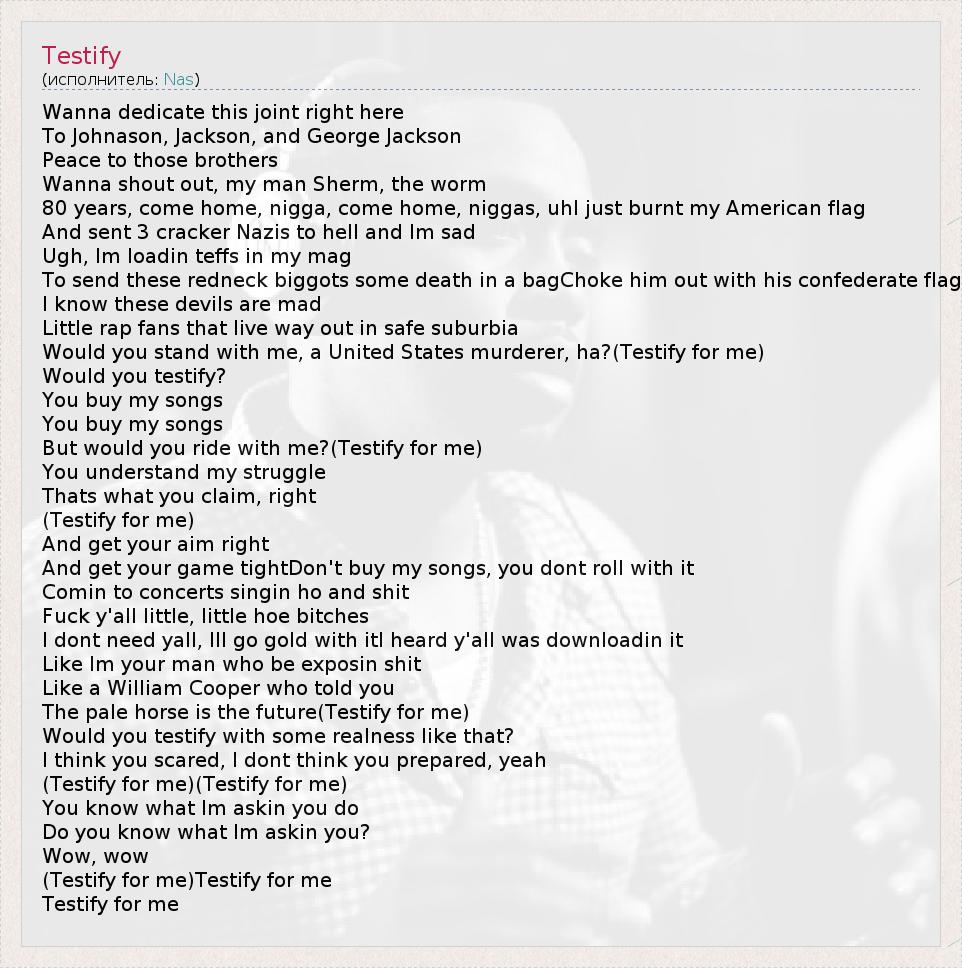 Wanna dedicate this joint right here To Johnason, Jackson, and George Jackson Peace to those brothers Wanna shout out, my man Sherm, the worm 80 years, come home, nigga, come home, niggas, uhI just burnt my American flag And sent 3 cracker Nazis to hell and Im sad Ugh, Im loadin teffs in my mag To send these redneck biggots some death in a bagChoke him out with his confederate flag I know these devils are mad Little rap fans that live way out in safe suburbia Would you stand with me, a United States murderer, ha?(Testify for me) Would you testify? You buy my songs You buy my songs But would you ride with me?(Testify for me) You understand my struggle Thats what you claim, right (Testify for me) And get your aim right And get your game tightDon't buy my songs, you dont roll with it Comin to concerts singin ho and shit Fuck y'all little, little hoe bitches I dont need yall, Ill go gold with itI heard y'all was downloadin it Like Im your man who be exposin shit Like a William Cooper who told you The pale horse is the future(Testify for me) Would you testify with some realness like that? I think you scared, I dont think you prepared, yeah (Testify for me)(Testify for me) You know what Im askin you do Do you know what Im askin you? Wow, wow (Testify for me)Testify for me Testify for me