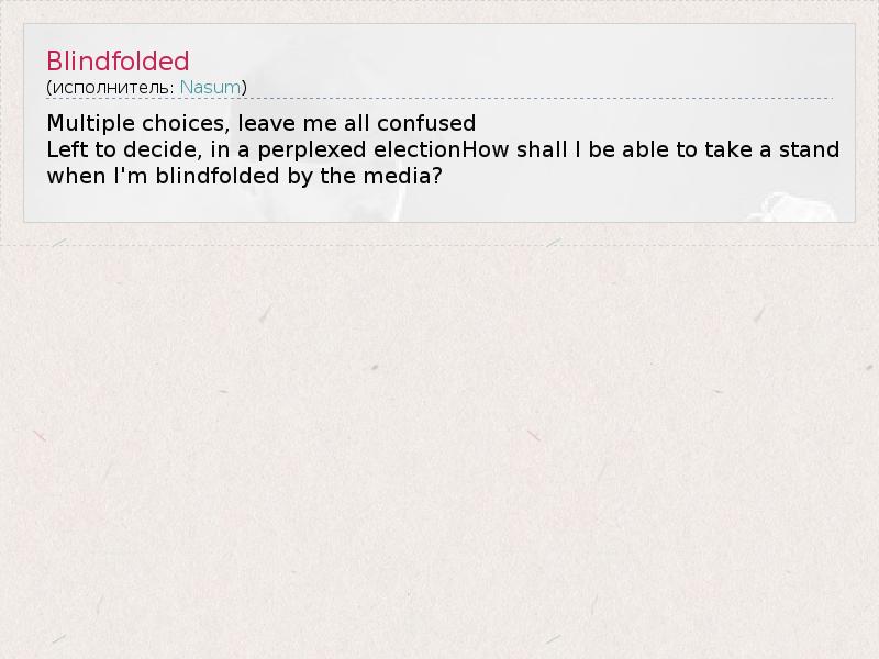 Multiple choices, leave me all confused Left to decide, in a perplexed electionHow shall I be able to take a stand when I'm blindfolded by the media?