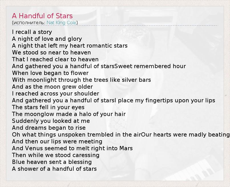 I recall a story A night of love and glory A night that left my heart romantic stars We stood so near to heaven That I reached clear to heaven And gathered you a handful of starsSweet remembered hour When love began to flower With moonlight through the trees like silver bars And as the moon grew older I reached across your shoulder And gathered you a handful of starsI place my fingertips upon your lips The stars fell in your eyes The moonglow made a halo of your hair Suddenly you looked at me And dreams began to rise Oh what things unspoken trembled in the airOur hearts were madly beating And then our lips were meeting And Venus seemed to melt right into Mars Then while we stood caressing Blue heaven sent a blessing A shower of a handful of stars