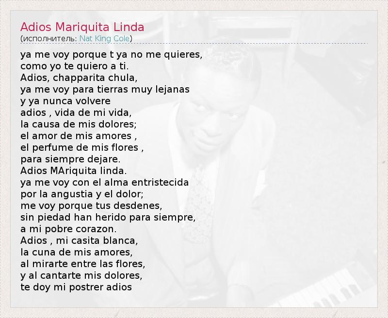 ya me voy porque t ya no me quieres, como yo te quiero a ti. Adios, chapparita chula, ya me voy para tierras muy lejanas y ya nunca volvere adios , vida de mi vida, la causa de mis dolores; el amor de mis amores , el perfume de mis flores , para siempre dejare. Adios MAriquita linda. ya me voy con el alma entristecida por la angustia y el dolor; me voy porque tus desdenes, sin piedad han herido para siempre, a mi pobre corazon. Adios , mi casita blanca, la cuna de mis amores, al mirarte entre las flores, y al cantarte mis dolores, te doy mi postrer adios