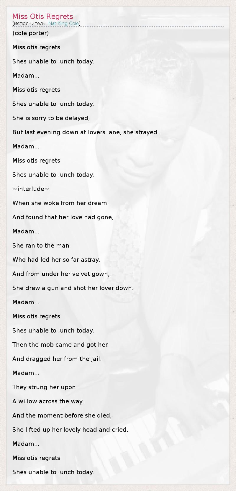 (cole porter) Miss otis regrets Shes unable to lunch today. Madam... Miss otis regrets Shes unable to lunch today. She is sorry to be delayed, But last evening down at lovers lane, she strayed. Madam... Miss otis regrets Shes unable to lunch today. ~interlude~ When she woke from her dream And found that her love had gone, Madam... She ran to the man Who had led her so far astray. And from under her velvet gown, She drew a gun and shot her lover down. Madam... Miss otis regrets Shes unable to lunch today. Then the mob came and got her And dragged her from the jail. Madam... They strung her upon A willow across the way. And the moment before she died, She lifted up her lovely head and cried. Madam... Miss otis regrets Shes unable to lunch today.