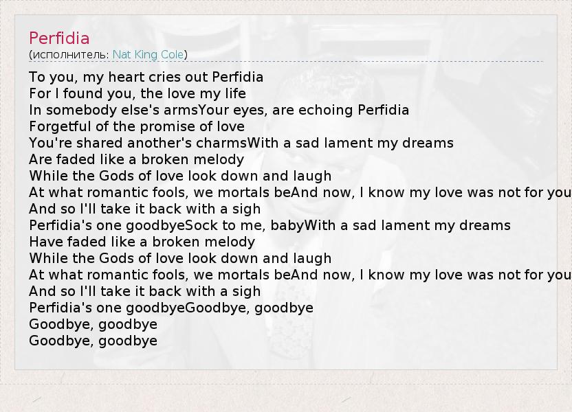To you, my heart cries out Perfidia For I found you, the love my life In somebody else's armsYour eyes, are echoing Perfidia Forgetful of the promise of love You're shared another's charmsWith a sad lament my dreams Are faded like a broken melody While the Gods of love look down and laugh At what romantic fools, we mortals beAnd now, I know my love was not for you And so I'll take it back with a sigh Perfidia's one goodbyeSock to me, babyWith a sad lament my dreams Have faded like a broken melody While the Gods of love look down and laugh At what romantic fools, we mortals beAnd now, I know my love was not for you And so I'll take it back with a sigh Perfidia's one goodbyeGoodbye, goodbye Goodbye, goodbye Goodbye, goodbye