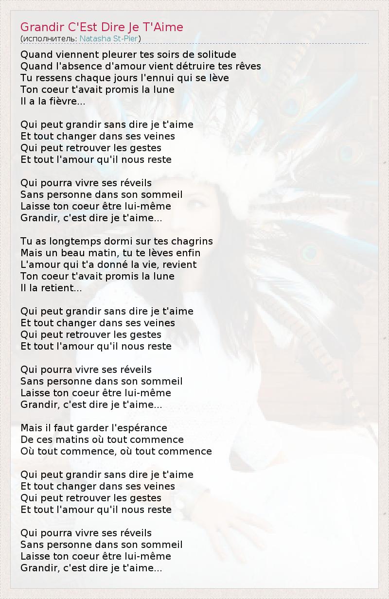 Когда вечерами ты плачешь от одиночества, От отсутствия любви, о которой ты мечтаешь... Когда каждый день ты чувствуешь тоску, Твое сердце обещало тебе лунный свет, У него лихорадка ... Кто может вырасти без того, чтобы сказать "я тебя люблю"? И все переворачивается внутри*. Кто может вернуть те жесты, И всю любовь, которая еще осталась? Кто просыпался Без того, чтобы однажды кто-то приснился? Позволь своему сердцу быть самим собой, Расти — это говорить "я тебя люблю"... Ты так долго пребывал в своей печали, Но в конце концов проснулся однажды утром. Любовь, которая дала тебе жизнь, вернулась, Твое сердце обещало тебе лунный свет И сохранило его... Кто может вырасти без того, чтобы сказать "я тебя люблю"? И все переворачивается внутри*. Кто может вернуть те жесты, И всю любовь, которая еще осталась? Кто просыпался Без того, чтобы однажды кто-то приснился. Позволь своему сердцу быть самим собой, Расти — это говорить "я тебя люблю"... Но нужно сохранить надежду Тех утренних часов, когда все начинается, Когда все начинается, когда все начинается... Кто может вырасти без того, чтобы сказать "я тебя люблю"? И все переворачивается внутри*. Кто может вернуть те жесты, И всю любовь, которая еще осталась? Кто просыпался Без того, чтобы однажды кто-то приснился? Позволь своему сердцу быть самим собой, Расти — это говорить "я тебя люблю"... *Досл.: меняется в жилах