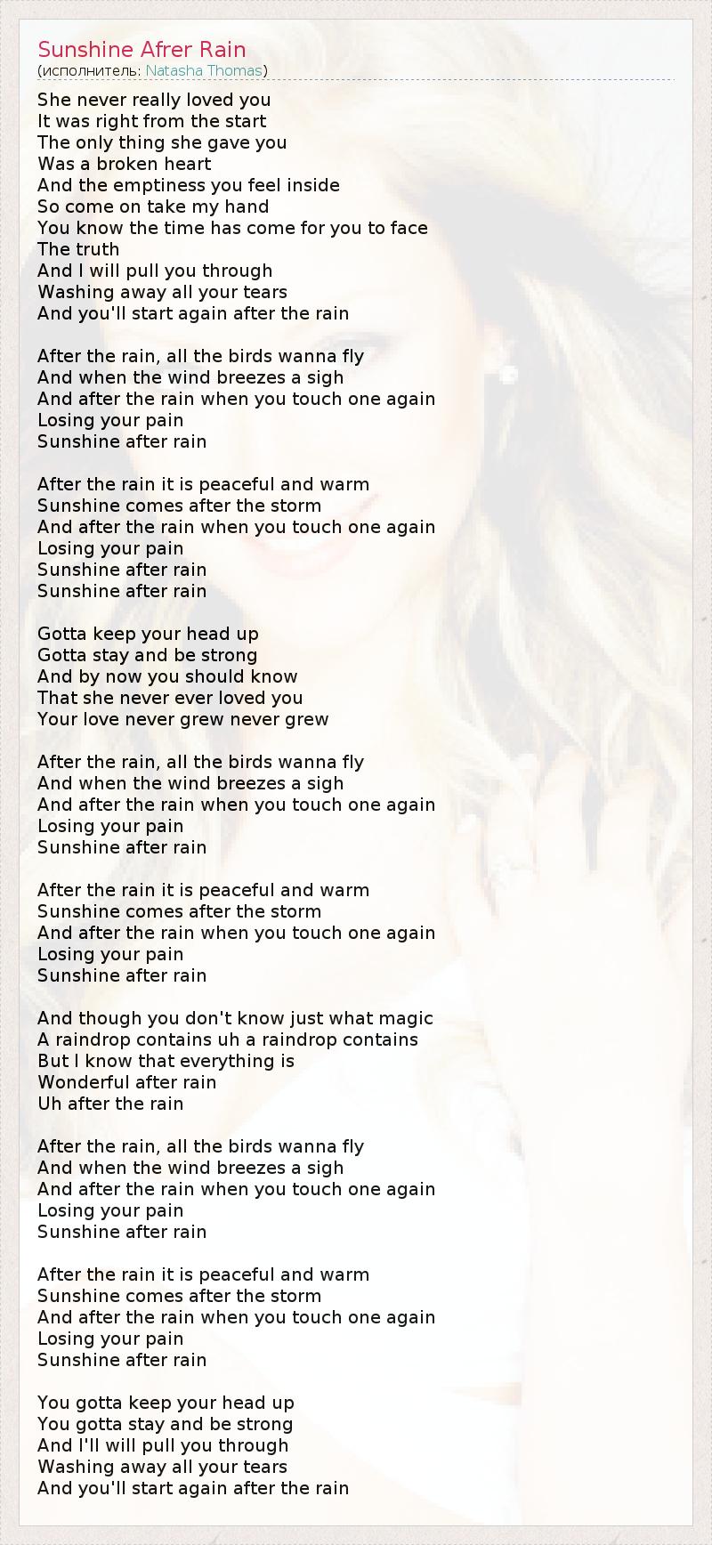 Она никогда по-настоящему не любила тебя, Так было с самого начала. Единственное, что она тебе подарила - Разбитое сердце И чувство внутренней пустоты. Так давай, возьми меня за руку. Ты понимаешь, что пришло время посмотреть Правде в глаза, А я помогу тебе через это пройти, Вытру все твои слёзы, И ты начнёшь заново после дождя... После дождя птицы устремляются в полёт, И ветерок легко вздыхает. После дождя касаясь сердца, Ты уже не чувствуешь боли. Солнце после дождя... После дождя спокойно и тепло, После грозы светит солнце. После дождя, дотрагиваясь до сердца, Ты уже не чувствуешь боли. Солнце после дождя, Солнце после дождя... Ты должен держать голову выше, Должен оставаться сильным. К этому моменту ты уже должен понять, Что она никогда тебя не любила. Твоя любовь так и не переросла в нечто большее... После дождя птицы устремляются в полёт, И ветерок легко вздыхает. После дождя, дотрагиваясь до сердца, Ты уже не чувствуешь боли. Солнце после дождя... После дождя спокойно и тепло, После грозы светит солнце. После дождя, дотрагиваясь до сердца, Ты уже не чувствуешь боли. Солнце после дождя... Хотя ты не знаешь, сколько магии В одной капле дождя, Я убеждена, что всё Замечательно после дождя, После дождя... После дождя птицы устремляются в полёт, И ветерок легко вздыхает. После дождя, дотрагиваясь до сердца, Ты уже не чувствуешь боли. Солнце после дождя... После дождя спокойно и тепло, После грозы светит солнце. После дождя, дотрагиваясь до сердца, Ты уже не чувствуешь боли. Солнце после дождя... Ты должен держать голову выше, Должен оставаться сильным, И я помогу тебе пройти через это, Я вытру все твои слёзы, И ты начнёшь заново после дождя...