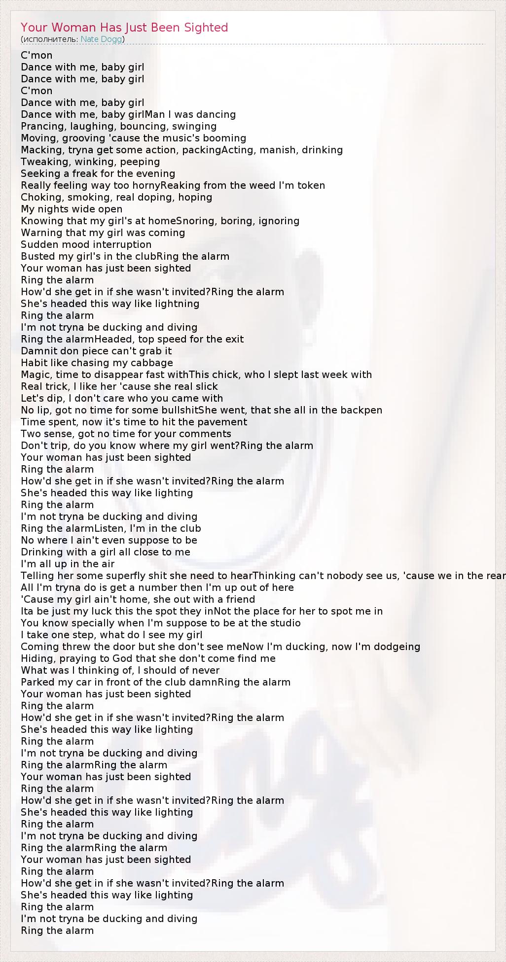 ГлавнаяИсполнителиNate DoggYour Woman Has Just Been Sighted
