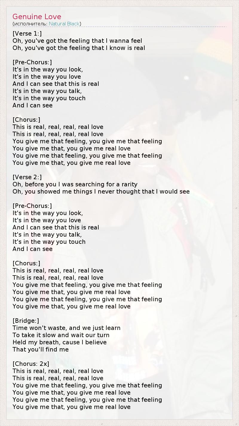 [1 куплет:] О, в тебе проснулось чувство, которое я хочу испытать. О, в тебе проснулось настоящее чувство, я знаю это. [Распевка:] Оно в том, как ты смотришь на меня, Оно в том, как ты любишь меня, И я понимаю, что оно настоящее. Оно в том, как ты говоришь со мной, Оно в том, как ты прикасаешься ко мне, И я понимаю... [Припев:] Это настоящая, настоящая, настоящая, настоящая любовь. Это настоящая, настоящая, настоящая, настоящая любовь. Ты даришь мне это чувство, ты даришь мне это чувство. Ты даришь мне его, ты даришь мне настоящую любовь. Ты даришь мне это чувство, ты даришь мне это чувство. Ты даришь мне его, ты даришь мне настоящую любовь. [2 куплет:] О, до тебя я искала чего-то необыкновенного. О, ты показал мне то, что я не ожидала увидеть. [Распевка:] Оно в том, как ты смотришь на меня, Оно в том, как ты любишь меня, И я понимаю, что оно настоящее. Оно в том, как ты говоришь со мной, Оно в том, как ты прикасаешься ко мне, И я понимаю... [Припев:] Это настоящая, настоящая, настоящая, настоящая любовь. Это настоящая, настоящая, настоящая, настоящая любовь. Ты даришь мне это чувство, ты даришь мне это чувство. Ты даришь мне его, ты даришь мне настоящую любовь. Ты даришь мне это чувство, ты даришь мне это чувство. Ты даришь мне его, ты даришь мне настоящую любовь. [Переход:] Мы не потеряем время и научимся Не спешить и ждать своей очереди. Я затаила дыхание, потому что я верю, Что ты найдёшь меня. [Припев: 2x] Это настоящая, настоящая, настоящая, настоящая любовь. Это настоящая, настоящая, настоящая, настоящая любовь. Ты даришь мне это чувство, ты даришь мне это чувство. Ты даришь мне его, ты даришь мне настоящую любовь. Ты даришь мне это чувство, ты даришь мне это чувство. Ты даришь мне его, ты даришь мне настоящую любовь.