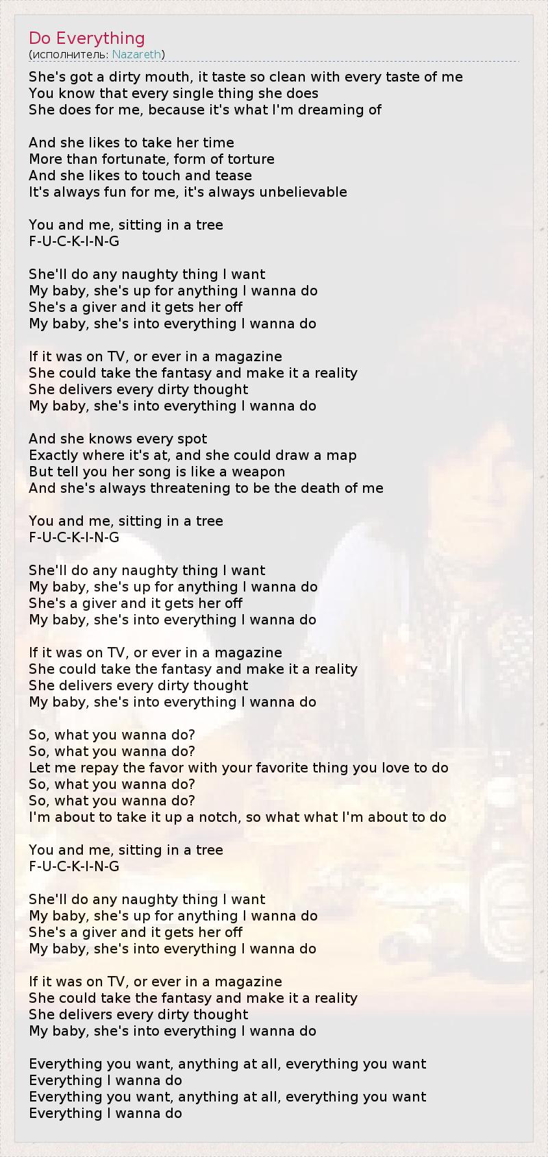 She's got a dirty mouth, it taste so clean with every taste of me You know that every single thing she does She does for me, because it's what I'm dreaming of And she likes to take her time More than fortunate, form of torture And she likes to touch and tease It's always fun for me, it's always unbelievable You and me, sitting in a tree F-U-C-K-I-N-G She'll do any naughty thing I want My baby, she's up for anything I wanna do She's a giver and it gets her off My baby, she's into everything I wanna do If it was on TV, or ever in a magazine She could take the fantasy and make it a reality She delivers every dirty thought My baby, she's into everything I wanna do And she knows every spot Exactly where it's at, and she could draw a map But tell you her song is like a weapon And she's always threatening to be the death of me You and me, sitting in a tree F-U-C-K-I-N-G She'll do any naughty thing I want My baby, she's up for anything I wanna do She's a giver and it gets her off My baby, she's into everything I wanna do If it was on TV, or ever in a magazine She could take the fantasy and make it a reality She delivers every dirty thought My baby, she's into everything I wanna do So, what you wanna do? So, what you wanna do? Let me repay the favor with your favorite thing you love to do So, what you wanna do? So, what you wanna do? I'm about to take it up a notch, so what what I'm about to do You and me, sitting in a tree F-U-C-K-I-N-G She'll do any naughty thing I want My baby, she's up for anything I wanna do She's a giver and it gets her off My baby, she's into everything I wanna do If it was on TV, or ever in a magazine She could take the fantasy and make it a reality She delivers every dirty thought My baby, she's into everything I wanna do Everything you want, anything at all, everything you want Everything I wanna do Everything you want, anything at all, everything you want Everything I wanna do