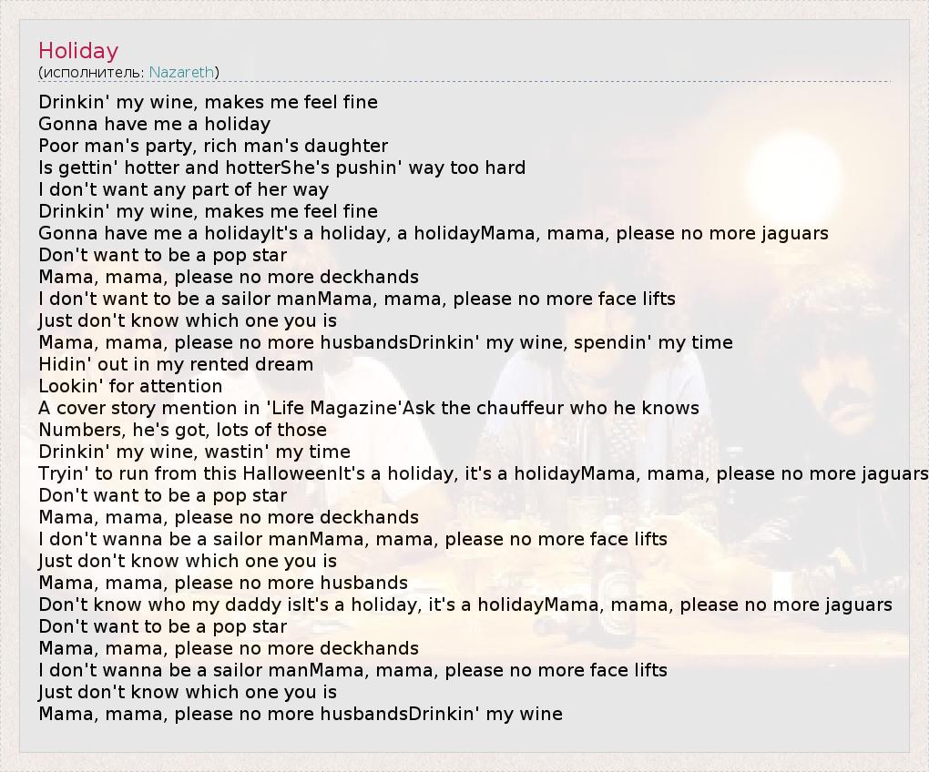 Drinkin' my wine, makes me feel fine Gonna have me a holiday Poor man's party, rich man's daughter Is gettin' hotter and hotterShe's pushin' way too hard I don't want any part of her way Drinkin' my wine, makes me feel fine Gonna have me a holidayIt's a holiday, a holidayMama, mama, please no more jaguars Don't want to be a pop star Mama, mama, please no more deckhands I don't want to be a sailor manMama, mama, please no more face lifts Just don't know which one you is Mama, mama, please no more husbandsDrinkin' my wine, spendin' my time Hidin' out in my rented dream Lookin' for attention A cover story mention in 'Life Magazine'Ask the chauffeur who he knows Numbers, he's got, lots of those Drinkin' my wine, wastin' my time Tryin' to run from this HalloweenIt's a holiday, it's a holidayMama, mama, please no more jaguars Don't want to be a pop star Mama, mama, please no more deckhands I don't wanna be a sailor manMama, mama, please no more face lifts Just don't know which one you is Mama, mama, please no more husbands Don't know who my daddy isIt's a holiday, it's a holidayMama, mama, please no more jaguars Don't want to be a pop star Mama, mama, please no more deckhands I don't wanna be a sailor manMama, mama, please no more face lifts Just don't know which one you is Mama, mama, please no more husbandsDrinkin' my wine