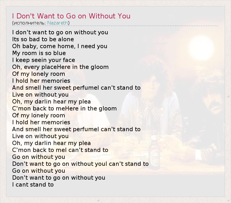 I don't want to go on without you Its so bad to be alone Oh baby, come home, I need you My room is so blue I keep seein your face Oh, every placeHere in the gloom Of my lonely room I hold her memories And smell her sweet perfumeI can't stand to Live on without you Oh, my darlin hear my plea C'mon back to meHere in the gloom Of my lonely room I hold her memories And smell her sweet perfumeI can't stand to Live on without you Oh, my darlin hear my plea C'mon back to meI can't stand to Go on without you Don't want to go on without youI can't stand to Go on without you Don't want to go on without you I cant stand to