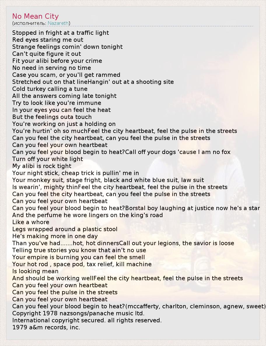 You're hurtin' oh so muchFeel the city heartbeat, feel the pulse in the streets