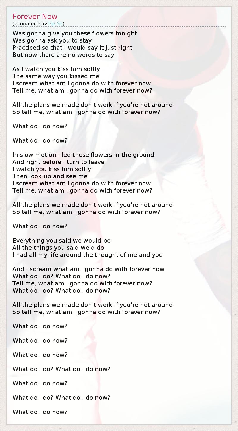 Я собирался подарить тебе эти цветы сегодня вечером, Собирался попросить тебя остаться, Так долго репетировал, что произнёс бы без запинки всё, Но теперь слов не осталось. Глядя, как ты мягко целуешь его Точно так же, как целовала меня, Я кричу – что мне делать теперь, Скажи, что мне делать с этой вечностью? Все наши замыслы не исполнятся, если тебя нет рядом, Так скажи, что мне делать с этой вечностью? Что мне теперь делать? Что мне теперь делать? Будто в замедленной съёмке я провожаю взглядом падающие на пол цветы, И перед самым уходом Я вижу, как ты мягко целуешь его, А потом поднимаешь взгляд и замечаешь меня. Я кричу – что мне делать теперь, Скажи, что мне делать с этой вечностью? Все наши замыслы не исполнятся, если тебя нет рядом, Так скажи, что мне делать с этой вечностью? Что мне теперь делать? Кем бы мы стали, если верить тебе, Сколько бы всего успели, по твоим словам, Вся моя жизнь была связана с мыслями о нас. Я кричу – что я буду делать с этой вечностью, Что мне делать? Что мне теперь делать? Скажи, что мне делать с этой вечностью? Что мне делать? Что мне теперь делать? Все наши замыслы не исполнятся, если тебя нет рядом, Так скажи, что мне делать с этой вечностью? Что мне теперь делать? Что мне теперь делать? Что мне теперь делать? Что мне делать? Что мне теперь делать? Что мне теперь делать? Что мне делать? Что мне теперь делать? Что мне теперь делать?