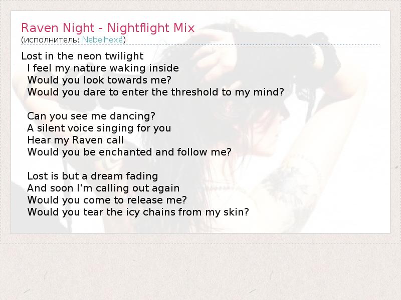 Lost in the neon twilight I feel my nature waking inside Would you look towards me? Would you dare to enter the threshold to my mind? Can you see me dancing? A silent voice singing for you Hear my Raven call Would you be enchanted and follow me? Lost is but a dream fading And soon I'm calling out again Would you come to release me? Would you tear the icy chains from my skin?