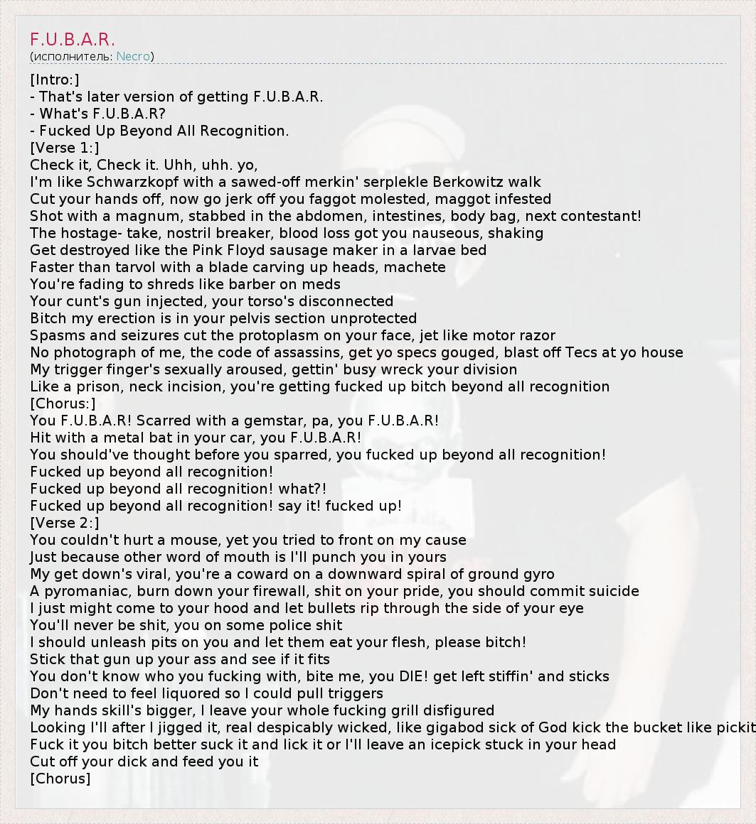 [Intro:] - That's later version of getting F.U.B.A.R. - What's F.U.B.A.R? - Fucked Up Beyond All Recognition. [Verse 1:] Check it, Check it. Uhh, uhh. yo, I'm like Schwarzkopf with a sawed-off merkin' serplekle Berkowitz walk Cut your hands off, now go jerk off you faggot molested, maggot infested Shot with a magnum, stabbed in the abdomen, intestines, body bag, next contestant! The hostage- take, nostril breaker, blood loss got you nauseous, shaking Get destroyed like the Pink Floyd sausage maker in a larvae bed Faster than tarvol with a blade carving up heads, machete You're fading to shreds like barber on meds Your cunt's gun injected, your torso's disconnected Bitch my erection is in your pelvis section unprotected Spasms and seizures cut the protoplasm on your face, jet like motor razor No photograph of me, the code of assassins, get yo specs gouged, blast off Tecs at yo house My trigger finger's sexually aroused, gettin' busy wreck your division Like a prison, neck incision, you're getting fucked up bitch beyond all recognition [Chorus:] You F.U.B.A.R! Scarred with a gemstar, pa, you F.U.B.A.R! Hit with a metal bat in your car, you F.U.B.A.R! You should've thought before you sparred, you fucked up beyond all recognition! Fucked up beyond all recognition! Fucked up beyond all recognition! what?! Fucked up beyond all recognition! say it! fucked up! [Verse 2:] You couldn't hurt a mouse, yet you tried to front on my cause Just because other word of mouth is I'll punch you in yours My get down's viral, you're a coward on a downward spiral of ground gyro A pyromaniac, burn down your firewall, shit on your pride, you should commit suicide I just might come to your hood and let bullets rip through the side of your eye You'll never be shit, you on some police shit I should unleash pits on you and let them eat your flesh, please bitch! Stick that gun up your ass and see if it fits You don't know who you fucking with, bite me, you DIE! get left stiffin' and sticks Don't need to feel liquored so I could pull triggers My hands skill's bigger, I leave your whole fucking grill disfigured Looking I'll after I jigged it, real despicably wicked, like gigabod sick of God kick the bucket like pickit Fuck it you bitch better suck it and lick it or I'll leave an icepick stuck in your head Cut off your dick and feed you it [Chorus]