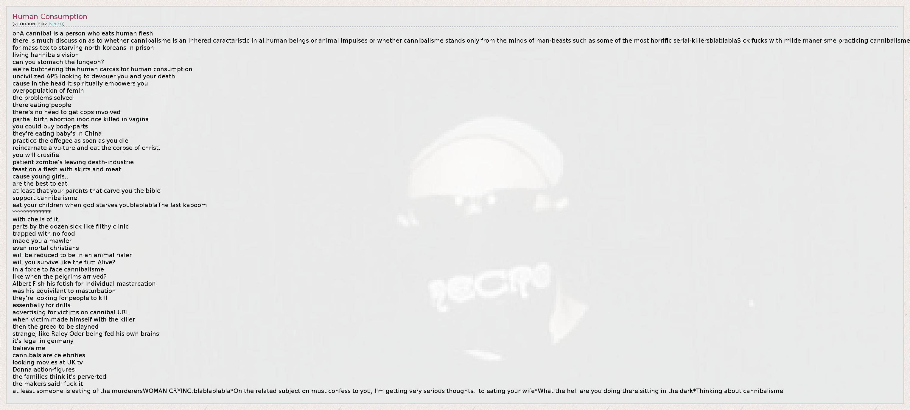 at least someone is eating of the murderersWOMAN CRYING.blablablabla*On the related subject on must confess to you, I'm getting very serious thoughts.. to eating your wife*What the hell are you doing there sitting in the dark*Thinking about cannibalisme