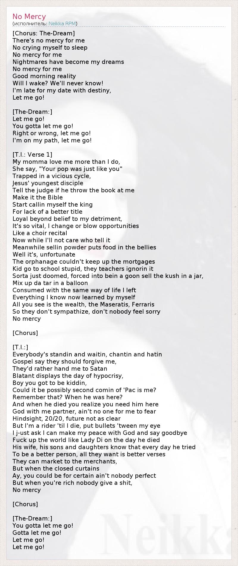 [Chorus: The-Dream] There's no mercy for me No crying myself to sleep No mercy for me Nightmares have become my dreams No mercy for me Good morning reality Will I wake? We'll never know! I'm late for my date with destiny, Let me go! [The-Dream:] Let me go! You gotta let me go! Right or wrong, let me go! I'm on my path, let me go! [T.I.: Verse 1] My momma love me more than I do, She say, "Your pop was just like you" Trapped in a vicious cycle, Jesus' youngest disciple Tell the judge if he throw the book at me Make it the Bible Start callin myself the king For lack of a better title Loyal beyond belief to my detriment, It's so vital, I change or blow opportunities Like a choir recital Now while I'll not care who tell it Meanwhile sellin powder puts food in the bellies Well it's, unfortunate The orphanage couldn't keep up the mortgages Kid go to school stupid, they teachers ignorin it Sorta just doomed, forced into bein a goon sell the kush in a jar, Mix up da tar in a balloon Consumed with the same way of life I left Everything I know now learned by myself All you see is the wealth, the Maseratis, Ferraris So they don't sympathize, don't nobody feel sorry No mercy [Chorus] [T.I.:] Everybody's standin and waitin, chantin and hatin Gospel say they should forgive me, They'd rather hand me to Satan Blatant displays the day of hypocrisy, Boy you got to be kiddin, Could it be possibly second comin of 'Pac is me? Remember that? When he was here? And when he died you realize you need him here God with me partner, ain't no one for me to fear Hindsight, 20/20, future not as clear But I'm a rider 'til I die, put bullets 'tween my eye I j-ust ask I can make my peace with God and say goodbye Fuck up the world like Lady Di on the day he died His wife, his sons and daughters know that every day he tried To be a better person, all they want is better verses They can market to the merchants, But when the closed curtains Ay, you could be for certain ain't nobody perfect But when you're rich nobody give a shit, No mercy [Chorus] [The-Dream:] You gotta let me go! Gotta let me go! Let me go! Let me go!
