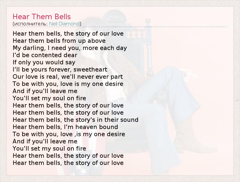 Hear them bells, the story of our love Hear them bells from up above My darling, I need you, more each day I'd be contented dear If only you would say I'll be yours forever, sweetheart Our love is real, we'll never ever part To be with you, love is my one desire And if you'll leave me You'll set my soul on fire Hear them bells, the story of our love Hear them bells, the story of our love Hear them bells, the story's in their sound Hear them bells, I'm heaven bound To be with you, love ,is my one desire And if you'll leave me You'll set my soul on fire Hear them bells, the story of our love Hear them bells, the story of our love