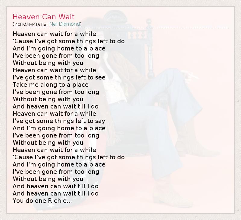 Heaven can wait for a while 'Cause I've got some things left to do And I'm going home to a place I've been gone from too long Without being with you Heaven can wait for a while I've got some things left to see Take me along to a place I've been gone from too long Without being with you And heaven can wait till I do Heaven can wait for a while I've got some things left to say And I'm going home to a place I've been gone from too long Without being with you Heaven can wait for a while 'Cause I've got some things left to do And I'm going home to a place I've been gone from too long Without being with you And heaven can wait till I do And heaven can wait till I do You do one Richie...