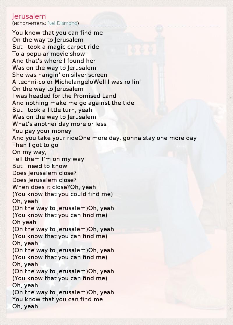 You know that you can find me On the way to Jerusalem But I took a magic carpet ride To a popular movie show And that's where I found her Was on the way to Jerusalem She was hangin' on silver screen A techni-color MichelangeloWell I was rollin' On the way to Jerusalem I was headed for the Promised Land And nothing make me go against the tide But I took a little turn, yeah Was on the way to Jerusalem What's another day more or less You pay your money And you take your rideOne more day, gonna stay one more day Then I got to go On my way, Tell them I'm on my way But I need to know Does Jerusalem close? Does Jerusalem close? When does it close?Oh, yeah (You know that you could find me) Oh, yeah (On the way to Jerusalem)Oh, yeah (You know that you can find me) Oh yeah (On the way to Jerusalem)Oh, yeah (You know that you can find me) Oh, yeah (On the way to Jerusalem)Oh, yeah (You know that you can find me) Oh, yeah (On the way to Jerusalem)Oh, yeah (You know that you can find me) Oh, yeah (On the way to Jerusalem)Oh, yeah You know that you can find me Oh, yeah