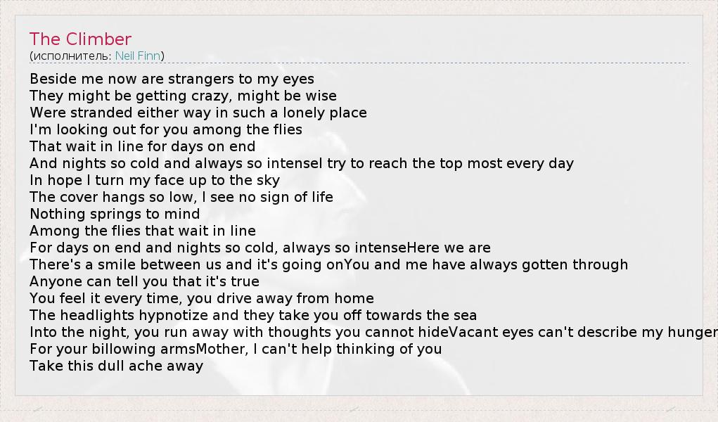 Это интересно:Нил Финн – знаменитый новозеландский певец, родился 27 мая 1958 года в городе Те-Амавуту, Новая Зеландия. При рождении Нил получил имя Корнелиус Муллан Финн. Финн учился в Sacred Heart, католической школе. затем поступил в колледж Те-Авамуту. Уже в возрасте двенадцати лет Нил решил, что станет музыкантом.Окончив в 1975 году школу, Нил Финн создает группу «After Hours». В группе кроме него были Марк Хью,... продолжение