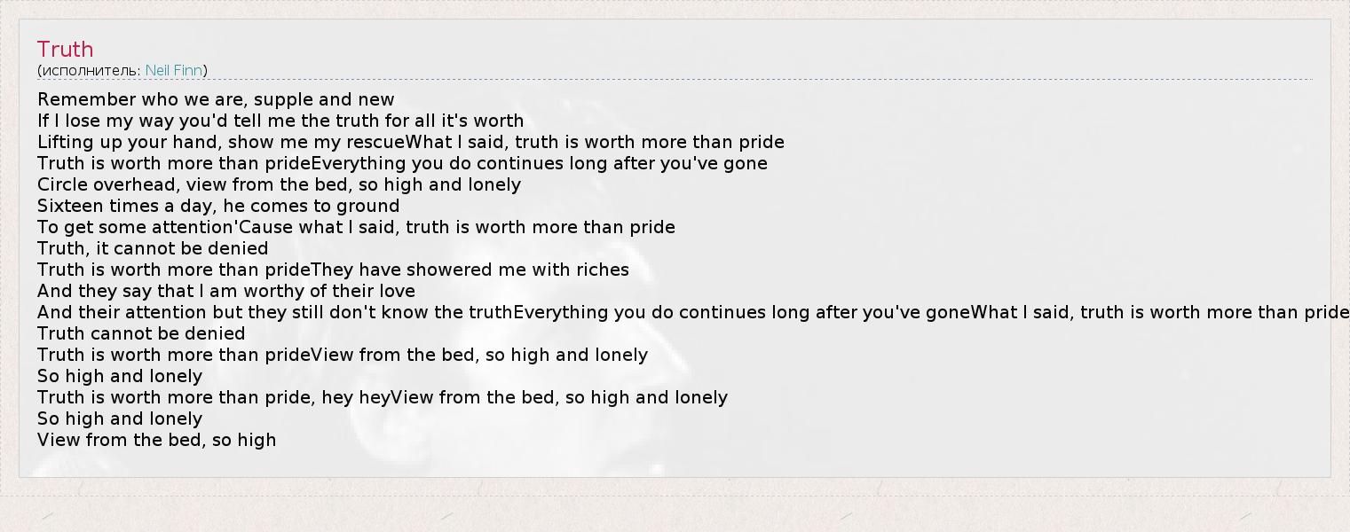 Это интересно:Нил Финн – знаменитый новозеландский певец, родился 27 мая 1958 года в городе Те-Амавуту, Новая Зеландия. При рождении Нил получил имя Корнелиус Муллан Финн. Финн учился в Sacred Heart, католической школе. затем поступил в колледж Те-Авамуту. Уже в возрасте двенадцати лет Нил решил, что станет музыкантом.Окончив в 1975 году школу, Нил Финн создает группу «After Hours». В группе кроме него были Марк Хью,... продолжение