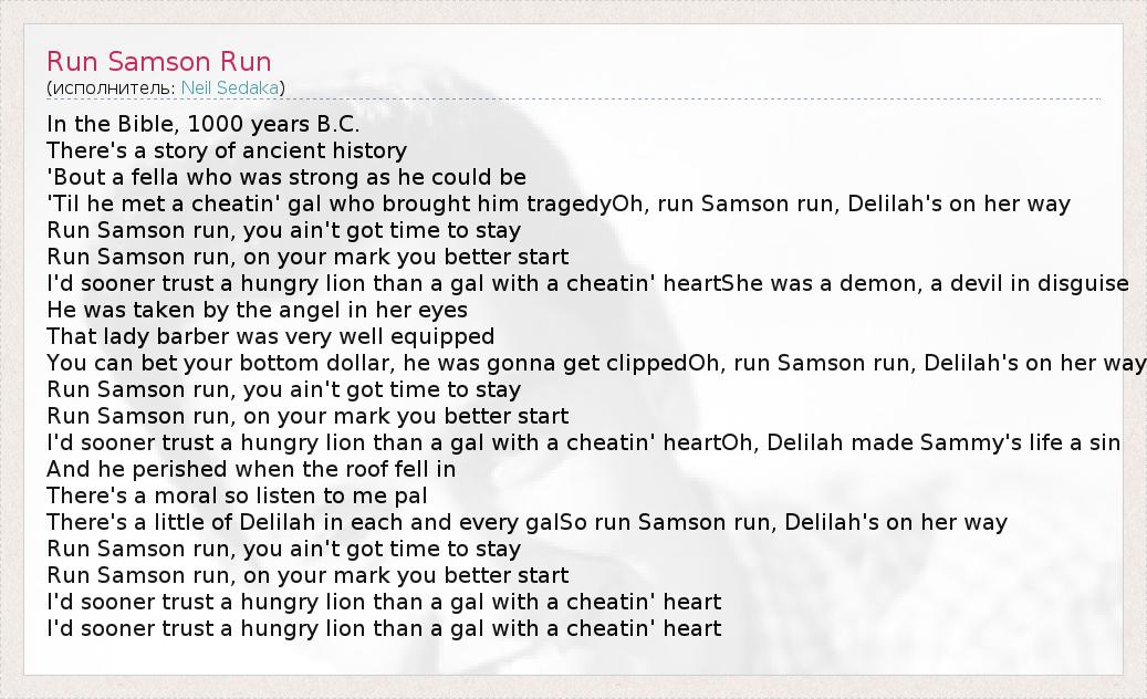 А как ты думаешь, о чем песня "Run Samson Run" ?