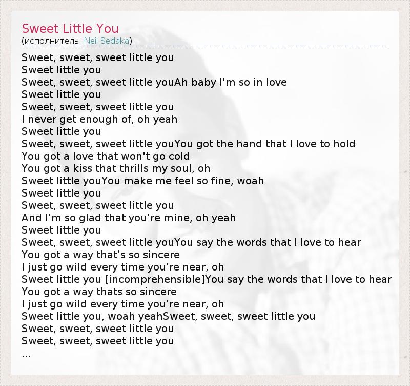 Sweet, sweet, sweet little you Sweet little you Sweet, sweet, sweet little youAh baby I'm so in love Sweet little you Sweet, sweet, sweet little you I never get enough of, oh yeah Sweet little you Sweet, sweet, sweet little youYou got the hand that I love to hold You got a love that won't go cold You got a kiss that thrills my soul, oh Sweet little youYou make me feel so fine, woah Sweet little you Sweet, sweet, sweet little you And I'm so glad that you're mine, oh yeah Sweet little you Sweet, sweet, sweet little youYou say the words that I love to hear You got a way that's so sincere I just go wild every time you're near, oh Sweet little you [incomprehensible]You say the words that I love to hear You got a way thats so sincere I just go wild every time you're near, oh Sweet little you, woah yeahSweet, sweet, sweet little you Sweet, sweet, sweet little you Sweet, sweet, sweet little you ...