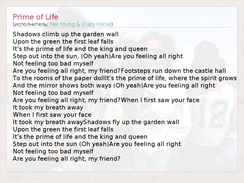 А как ты думаешь, о чем песня "Prime of Life" ?
