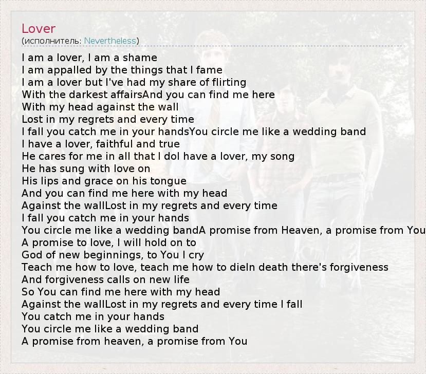 I am a lover, I am a shame I am appalled by the things that I fame I am a lover but I've had my share of flirting With the darkest affairsAnd you can find me here With my head against the wall Lost in my regrets and every time I fall you catch me in your handsYou circle me like a wedding band I have a lover, faithful and true He cares for me in all that I doI have a lover, my song He has sung with love on His lips and grace on his tongue And you can find me here with my head Against the wallLost in my regrets and every time I fall you catch me in your hands You circle me like a wedding bandA promise from Heaven, a promise from You A promise to love, I will hold on to God of new beginnings, to You I cry Teach me how to love, teach me how to dieIn death there's forgiveness And forgiveness calls on new life So You can find me here with my head Against the wallLost in my regrets and every time I fall You catch me in your hands You circle me like a wedding band A promise from heaven, a promise from You