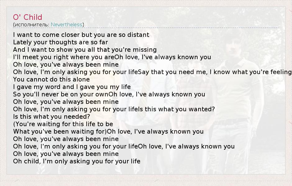 I want to come closer but you are so distant Lately your thoughts are so far And I want to show you all that you're missing I'll meet you right where you areOh love, I've always known you Oh love, you've always been mine Oh love, I'm only asking you for your lifeSay that you need me, I know what you're feeling You cannot do this alone I gave my word and I gave you my life So you'll never be on your ownOh love, I've always known you Oh love, you've always been mine Oh love, I'm only asking you for your lifeIs this what you wanted? Is this what you needed? (You're waiting for this life to be What you've been waiting for)Oh love, I've always known you Oh love, you've always been mine Oh love, I'm only asking you for your lifeOh love, I've always known you Oh love, you've always been mine Oh child, I'm only asking you for your life