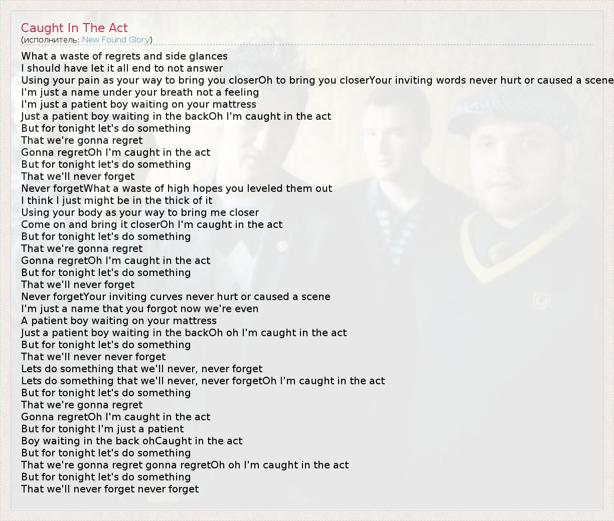 What a waste of regrets and side glances I should have let it all end to not answer Using your pain as your way to bring you closerOh to bring you closerYour inviting words never hurt or caused a scene I'm just a name under your breath not a feeling I'm just a patient boy waiting on your mattress Just a patient boy waiting in the backOh I'm caught in the act But for tonight let's do something That we're gonna regret Gonna regretOh I'm caught in the act But for tonight let's do something That we'll never forget Never forgetWhat a waste of high hopes you leveled them out I think I just might be in the thick of it Using your body as your way to bring me closer Come on and bring it closerOh I'm caught in the act But for tonight let's do something That we're gonna regret Gonna regretOh I'm caught in the act But for tonight let's do something That we'll never forget Never forgetYour inviting curves never hurt or caused a scene I'm just a name that you forgot now we're even A patient boy waiting on your mattress Just a patient boy waiting in the backOh oh I'm caught in the act But for tonight let's do something That we'll never never forget Lets do something that we'll never, never forget Lets do something that we'll never, never forgetOh I'm caught in the act But for tonight let's do something That we're gonna regret Gonna regretOh I'm caught in the act But for tonight I'm just a patient Boy waiting in the back ohCaught in the act But for tonight let's do something That we're gonna regret gonna regretOh oh I'm caught in the act But for tonight let's do something That we'll never forget never forget