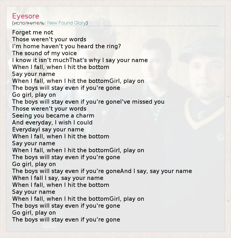 Forget me not Those weren't your words I'm home haven't you heard the ring? The sound of my voice I know it isn't muchThat's why I say your name When I fall, when I hit the bottom Say your name When I fall, when I hit the bottomGirl, play on The boys will stay even if you're gone Go girl, play on The boys will stay even if you're goneI've missed you Those weren't your words Seeing you became a charm And everyday, I wish I could EverydayI say your name When I fall, when I hit the bottom Say your name When I fall, when I hit the bottomGirl, play on The boys will stay even if you're gone Go girl, play on The boys will stay even if you're goneAnd I say, say your name When I fall I say, say your name When I fall, when I hit the bottom Say your name When I fall, when I hit the bottomGirl, play on The boys will stay even if you're gone Go girl, play on The boys will stay even if you're gone