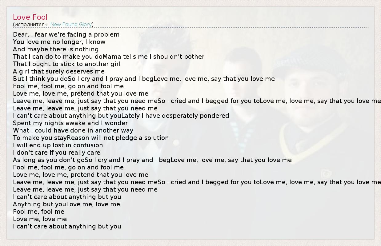 Dear, I fear we're facing a problem You love me no longer, I know And maybe there is nothing That I can do to make you doMama tells me I shouldn't bother That I ought to stick to another girl A girl that surely deserves me But I think you doSo I cry and I pray and I begLove me, love me, say that you love me Fool me, fool me, go on and fool me Love me, love me, pretend that you love me Leave me, leave me, just say that you need meSo I cried and I begged for you toLove me, love me, say that you love me Leave me, leave me, just say that you need me I can't care about anything but youLately I have desperately pondered Spent my nights awake and I wonder What I could have done in another way To make you stayReason will not pledge a solution I will end up lost in confusion I don't care if you really care As long as you don't goSo I cry and I pray and I begLove me, love me, say that you love me Fool me, fool me, go on and fool me Love me, love me, pretend that you love me Leave me, leave me, just say that you need meSo I cried and I begged for you toLove me, love me, say that you love me Leave me, leave me, just say that you need me I can't care about anything but you Anything but youLove me, love me Fool me, fool me Love me, love me I can't care about anything but you