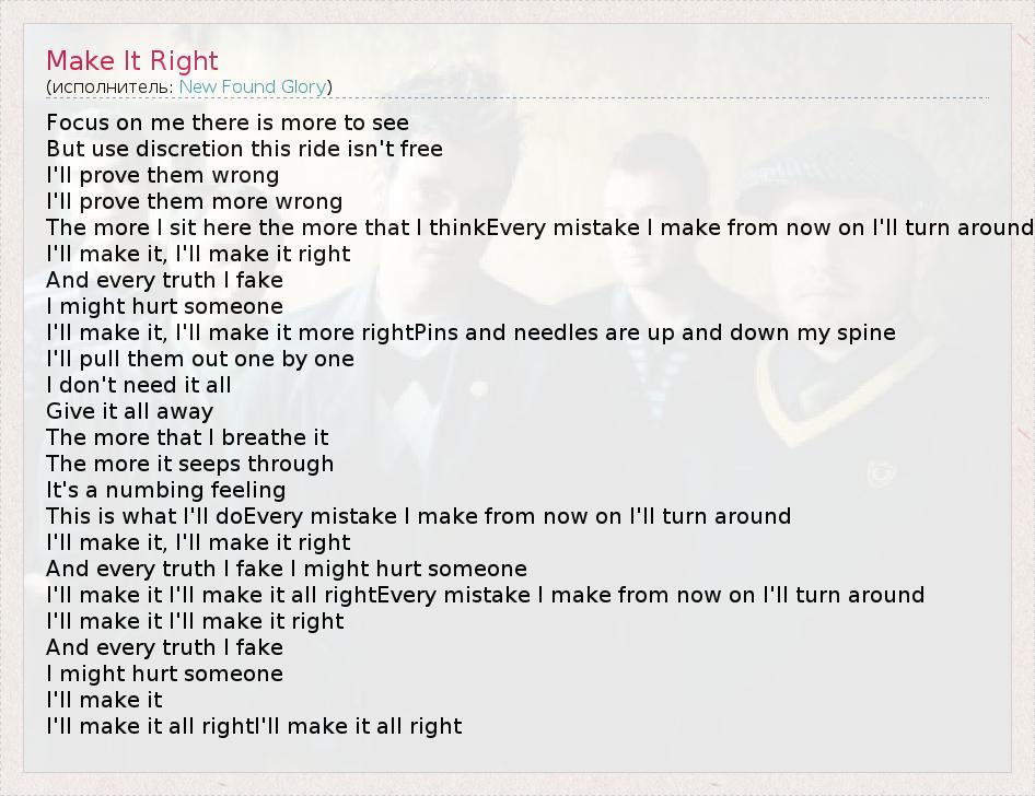 Focus on me there is more to see But use discretion this ride isn't free I'll prove them wrong I'll prove them more wrong The more I sit here the more that I thinkEvery mistake I make from now on I'll turn around I'll make it, I'll make it right And every truth I fake I might hurt someone I'll make it, I'll make it more rightPins and needles are up and down my spine I'll pull them out one by one I don't need it all Give it all away The more that I breathe it The more it seeps through It's a numbing feeling This is what I'll doEvery mistake I make from now on I'll turn around I'll make it, I'll make it right And every truth I fake I might hurt someone I'll make it I'll make it all rightEvery mistake I make from now on I'll turn around I'll make it I'll make it right And every truth I fake I might hurt someone I'll make it I'll make it all rightI'll make it all right