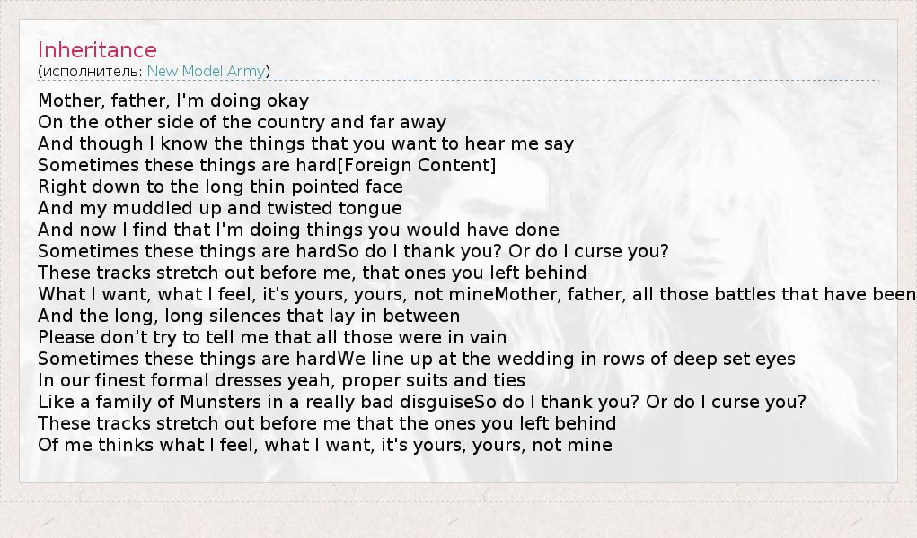 Mother, father, I'm doing okay On the other side of the country and far away And though I know the things that you want to hear me say Sometimes these things are hard[Foreign Content] Right down to the long thin pointed face And my muddled up and twisted tongue And now I find that I'm doing things you would have done Sometimes these things are hardSo do I thank you? Or do I curse you? These tracks stretch out before me, that ones you left behind What I want, what I feel, it's yours, yours, not mineMother, father, all those battles that have been And the long, long silences that lay in between Please don't try to tell me that all those were in vain Sometimes these things are hardWe line up at the wedding in rows of deep set eyes In our finest formal dresses yeah, proper suits and ties Like a family of Munsters in a really bad disguiseSo do I thank you? Or do I curse you? These tracks stretch out before me that the ones you left behind Of me thinks what I feel, what I want, it's yours, yours, not mine