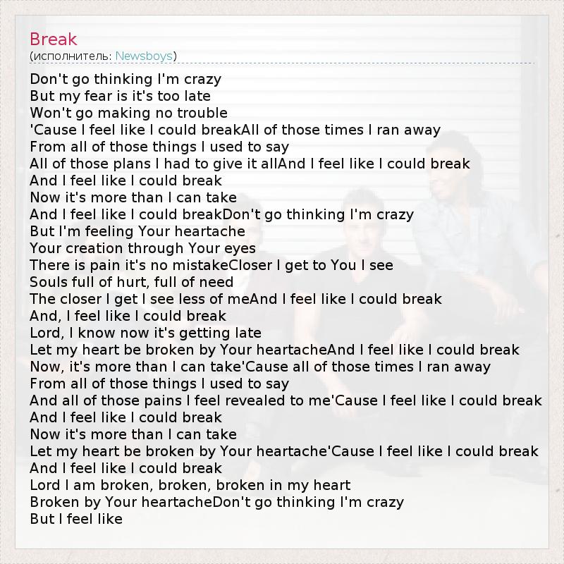 Don't go thinking I'm crazy But my fear is it's too late Won't go making no trouble 'Cause I feel like I could breakAll of those times I ran away From all of those things I used to say All of those plans I had to give it allAnd I feel like I could break And I feel like I could break Now it's more than I can take And I feel like I could breakDon't go thinking I'm crazy But I'm feeling Your heartache Your creation through Your eyes There is pain it's no mistakeCloser I get to You I see Souls full of hurt, full of need The closer I get I see less of meAnd I feel like I could break And, I feel like I could break Lord, I know now it's getting late Let my heart be broken by Your heartacheAnd I feel like I could break Now, it's more than I can take'Cause all of those times I ran away From all of those things I used to say And all of those pains I feel revealed to me'Cause I feel like I could break And I feel like I could break Now it's more than I can take Let my heart be broken by Your heartache'Cause I feel like I could break And I feel like I could break Lord I am broken, broken, broken in my heart Broken by Your heartacheDon't go thinking I'm crazy But I feel like