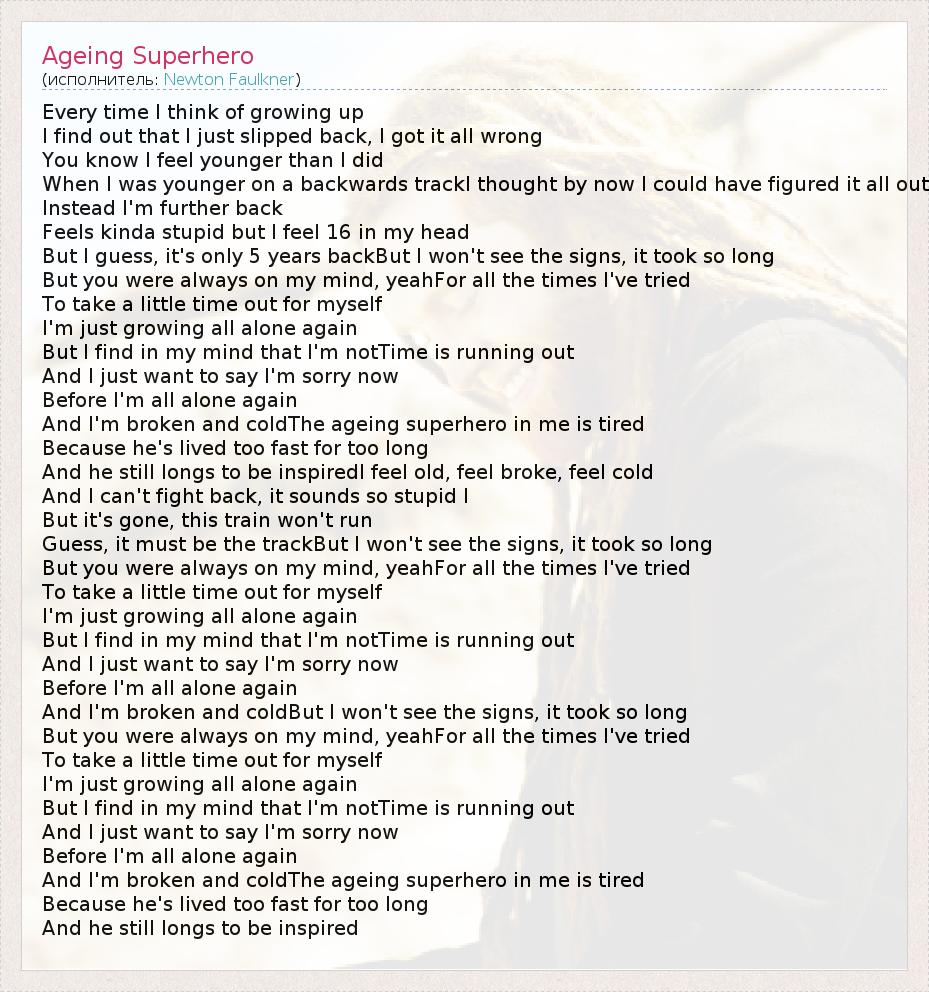 Every time I think of growing up I find out that I just slipped back, I got it all wrong You know I feel younger than I did When I was younger on a backwards trackI thought by now I could have figured it all out Instead I'm further back Feels kinda stupid but I feel 16 in my head But I guess, it's only 5 years backBut I won't see the signs, it took so long But you were always on my mind, yeahFor all the times I've tried To take a little time out for myself I'm just growing all alone again But I find in my mind that I'm notTime is running out And I just want to say I'm sorry now Before I'm all alone again And I'm broken and coldThe ageing superhero in me is tired Because he's lived too fast for too long And he still longs to be inspiredI feel old, feel broke, feel cold And I can't fight back, it sounds so stupid I But it's gone, this train won't run Guess, it must be the trackBut I won't see the signs, it took so long But you were always on my mind, yeahFor all the times I've tried To take a little time out for myself I'm just growing all alone again But I find in my mind that I'm notTime is running out And I just want to say I'm sorry now Before I'm all alone again And I'm broken and coldBut I won't see the signs, it took so long But you were always on my mind, yeahFor all the times I've tried To take a little time out for myself I'm just growing all alone again But I find in my mind that I'm notTime is running out And I just want to say I'm sorry now Before I'm all alone again And I'm broken and coldThe ageing superhero in me is tired Because he's lived too fast for too long And he still longs to be inspired