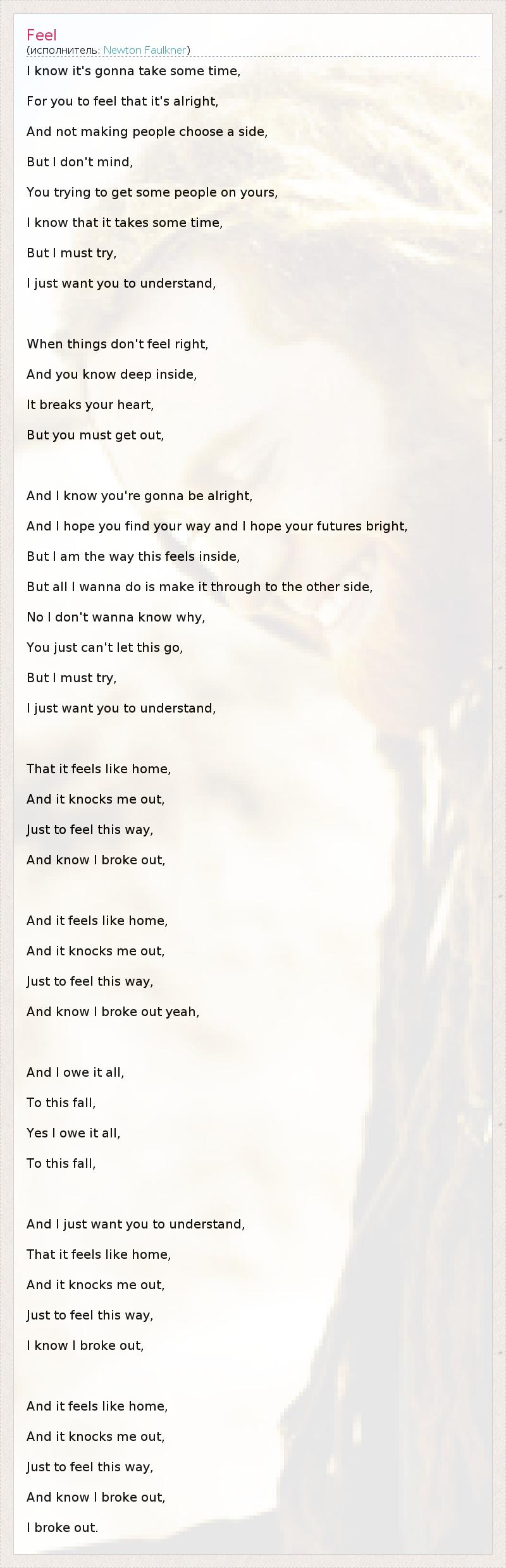 I know it's gonna take some time, For you to feel that it's alright, And not making people choose a side, But I don't mind, You trying to get some people on yours, I know that it takes some time, But I must try, I just want you to understand, When things don't feel right, And you know deep inside, It breaks your heart, But you must get out, And I know you're gonna be alright, And I hope you find your way and I hope your futures bright, But I am the way this feels inside, But all I wanna do is make it through to the other side, No I don't wanna know why, You just can't let this go, But I must try, I just want you to understand, That it feels like home, And it knocks me out, Just to feel this way, And know I broke out, And it feels like home, And it knocks me out, Just to feel this way, And know I broke out yeah, And I owe it all, To this fall, Yes I owe it all, To this fall, And I just want you to understand, That it feels like home, And it knocks me out, Just to feel this way, I know I broke out, And it feels like home, And it knocks me out, Just to feel this way, And know I broke out, I broke out.