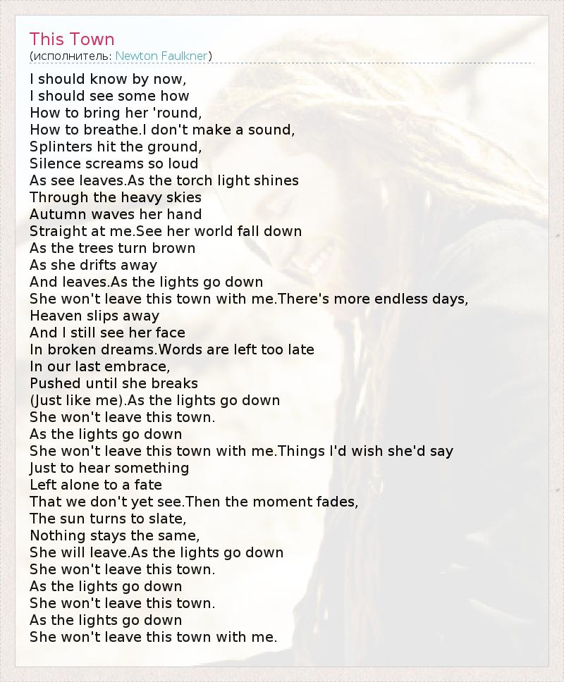 I should know by now, I should see some how How to bring her 'round, How to breathe.I don't make a sound, Splinters hit the ground, Silence screams so loud As see leaves.As the torch light shines Through the heavy skies Autumn waves her hand Straight at me.See her world fall down As the trees turn brown As she drifts away And leaves.As the lights go down She won't leave this town with me.There's more endless days, Heaven slips away And I still see her face In broken dreams.Words are left too late In our last embrace, Pushed until she breaks (Just like me).As the lights go down She won't leave this town. As the lights go down She won't leave this town with me.Things I'd wish she'd say Just to hear something Left alone to a fate That we don't yet see.Then the moment fades, The sun turns to slate, Nothing stays the same, She will leave.As the lights go down She won't leave this town. As the lights go down She won't leave this town. As the lights go down She won't leave this town with me.